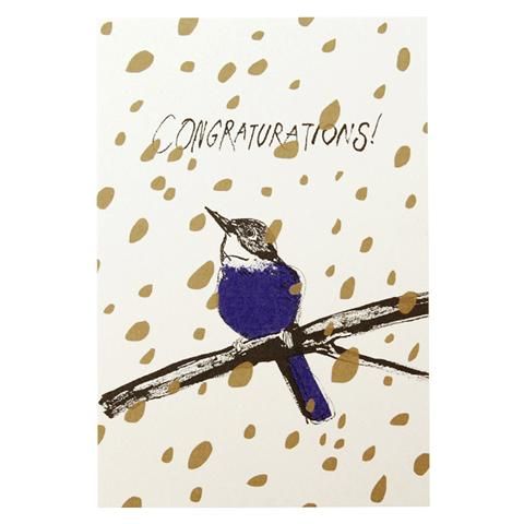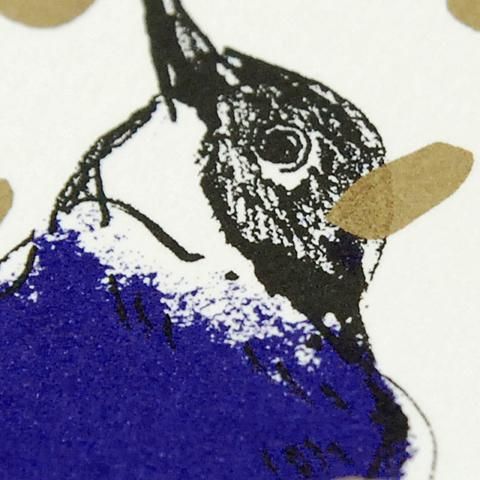 割り箸を墨汁につけて描く技法によるアートワーク。そこに藍と金の特色を贅沢に使った配色。三色の重ね塗りなので、藍も金も下地の色により発色が異なり、ところどころ透けていたり、立体感のある仕上がりになっています。紙はモコモコと自然な風合いのあるビオトープ紙を採用。上質な紙に手書きで描いたようなギフトカードです。