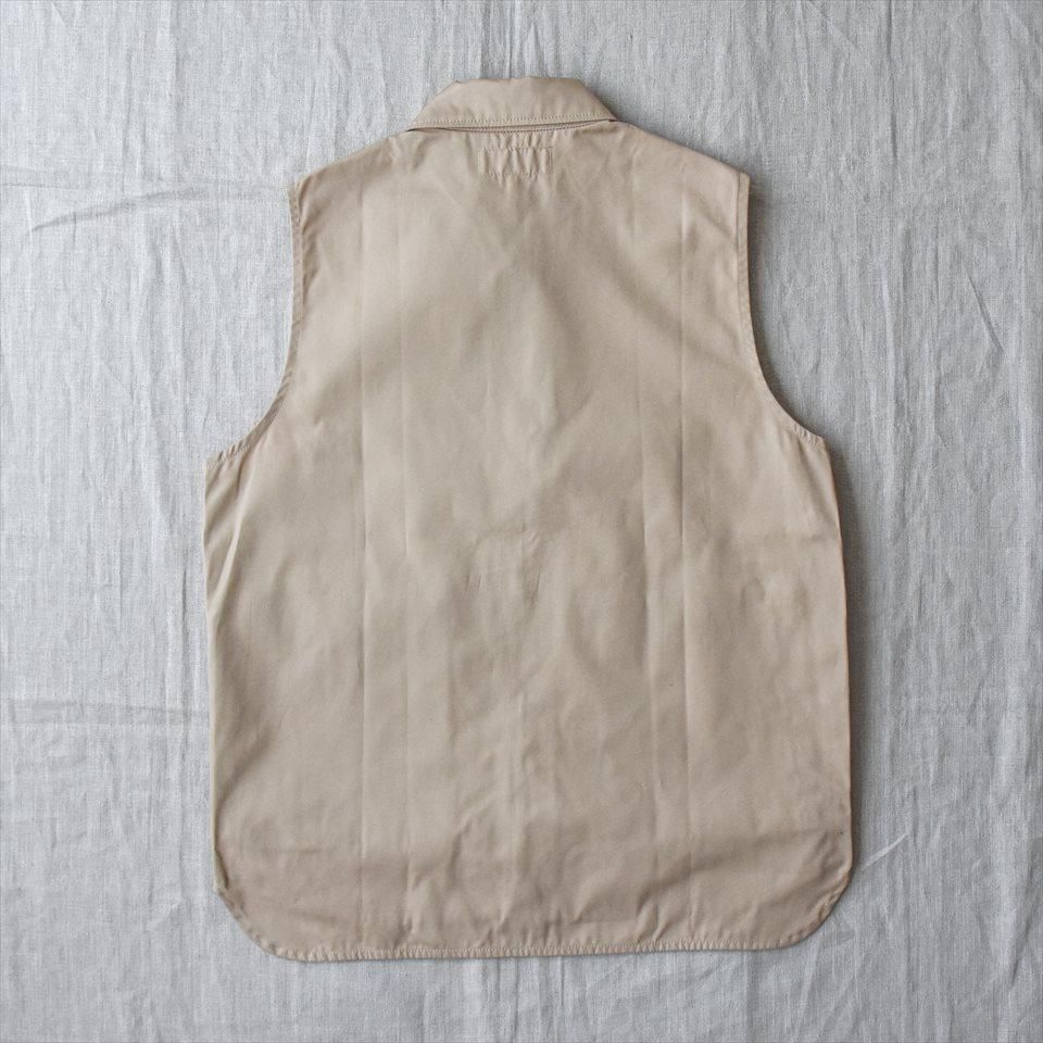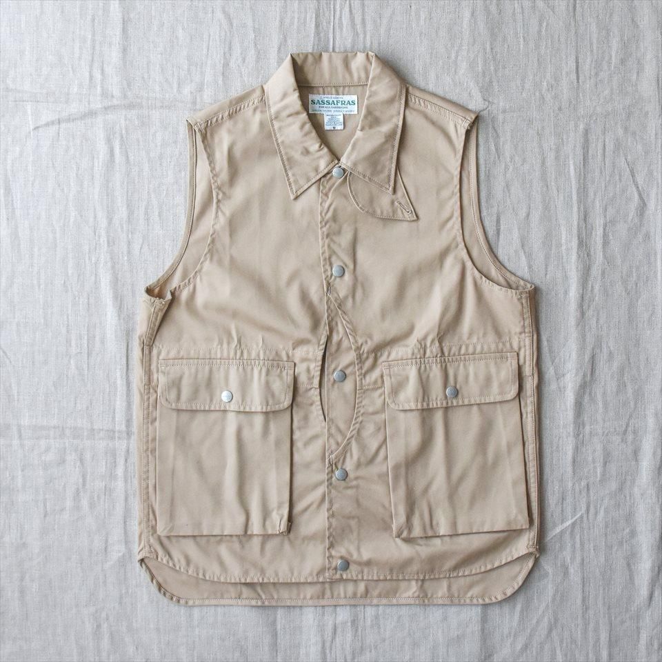 胸元の左右前面がハンティングポケットが、背中まで繋がる大容量ポケットのベスト。襟を立てて着られるよう大きめのチストラップ付き。春先や秋冬の急な寒さにも対応できるよう、裏地にナイロンタフタを付けているので保温性に優れています。フラップ付きでマチのある立体で大きめのポケットが左右についていて、いずれもサイドはハンドウォームポケット仕様。作業着として着る時には道具入れとしてとても便利な仕様で、ササフラスならではのワークウエアの魅力が随所にみられます。