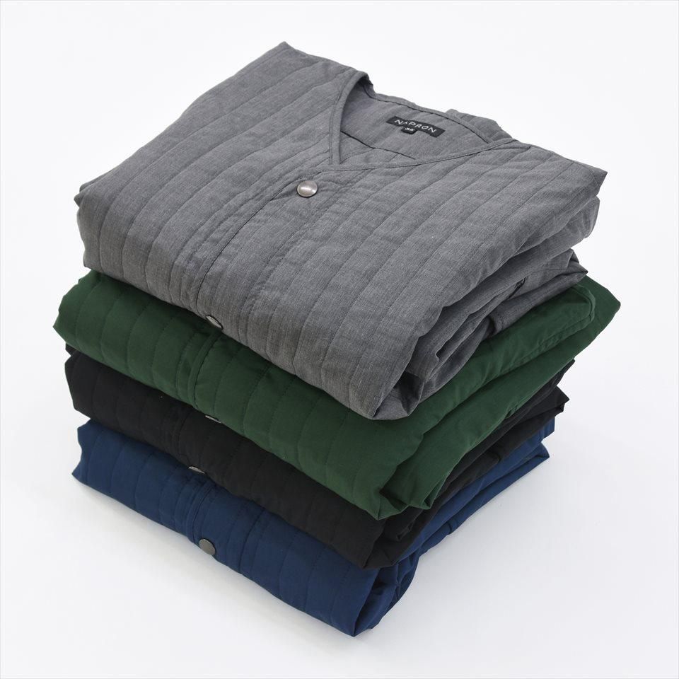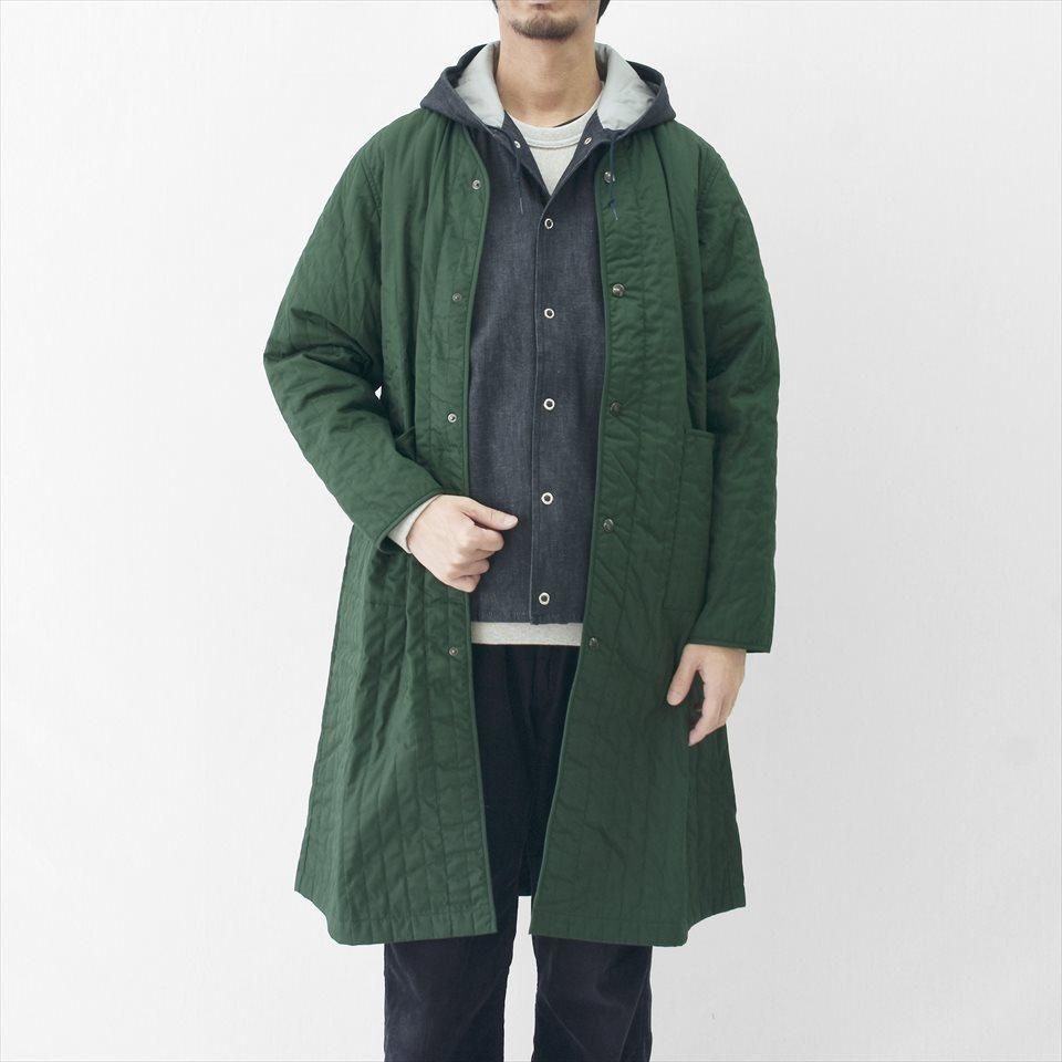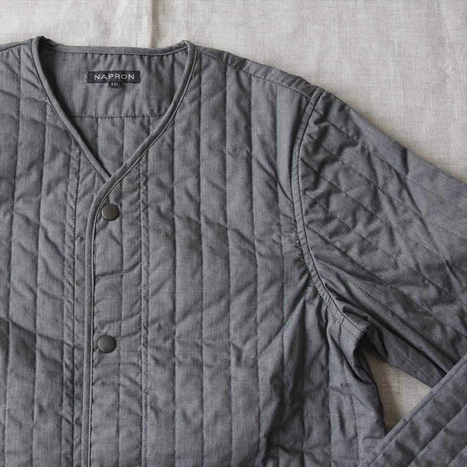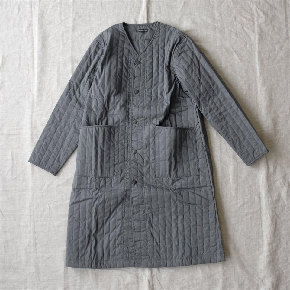 首元すっきりなノーカラーのキルティングコート。ナプロンの中ではやや細身のシルエットで、アウターとしてはもちろん、インナーダウンのようにアウターの下にミドルレイヤーとしても活躍します。首元、袖口、ポケット口はパイピング仕上げ。素材は、NAPRONオリジナルの両面タテキルト。スッキリとした縦(たて)ステッチと軽量で暖かな中綿キルト。