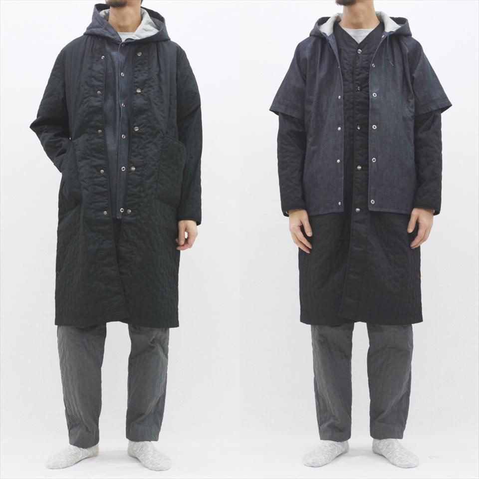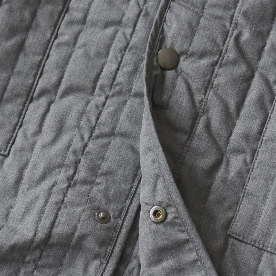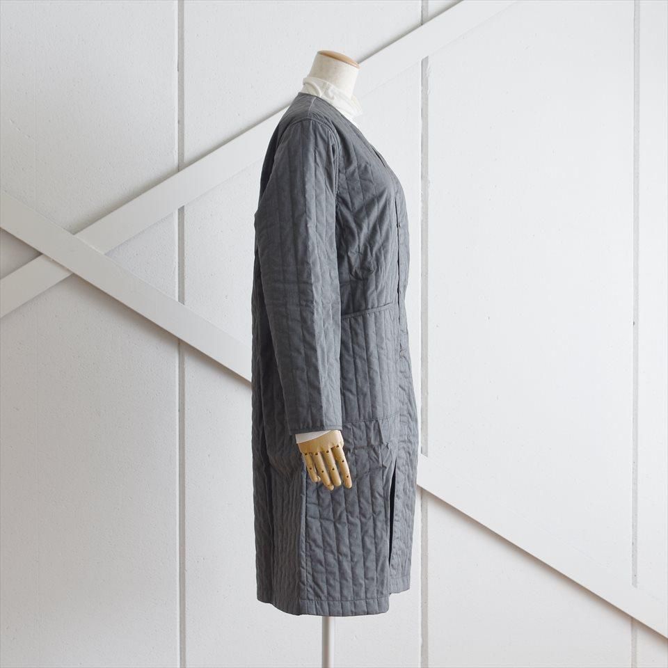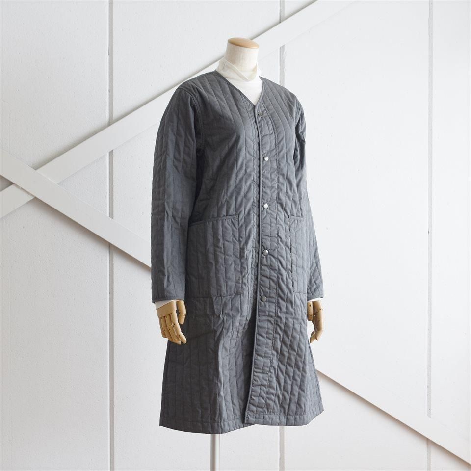 首元すっきりなノーカラーのキルティングコート。ナプロンの中ではやや細身のシルエットで、アウターとしてはもちろん、インナーダウンのようにアウターの下にミドルレイヤーとしても活躍します。首元、袖口、ポケット口はパイピング仕上げ。素材は、NAPRONオリジナルの両面タテキルト。スッキリとした縦(たて)ステッチと軽量で暖かな中綿キルト。