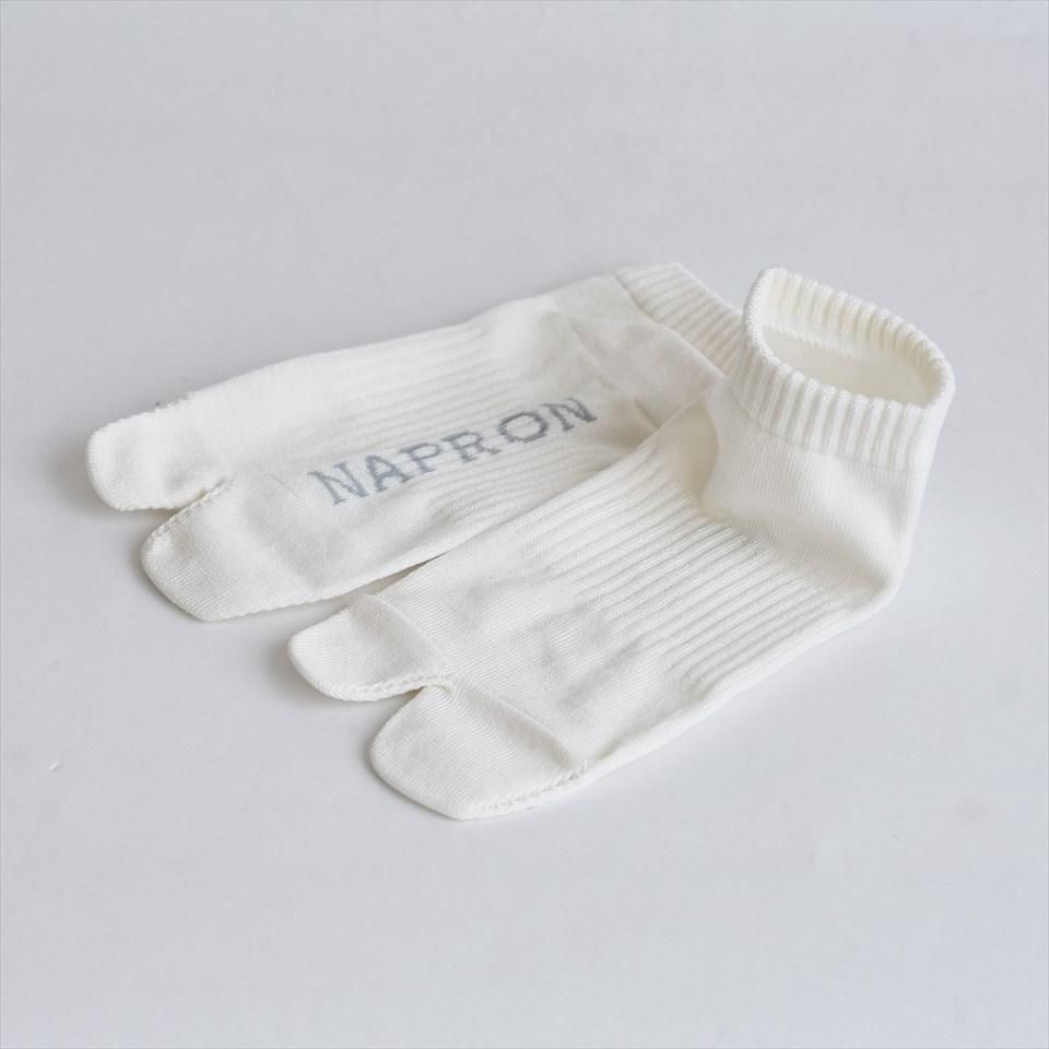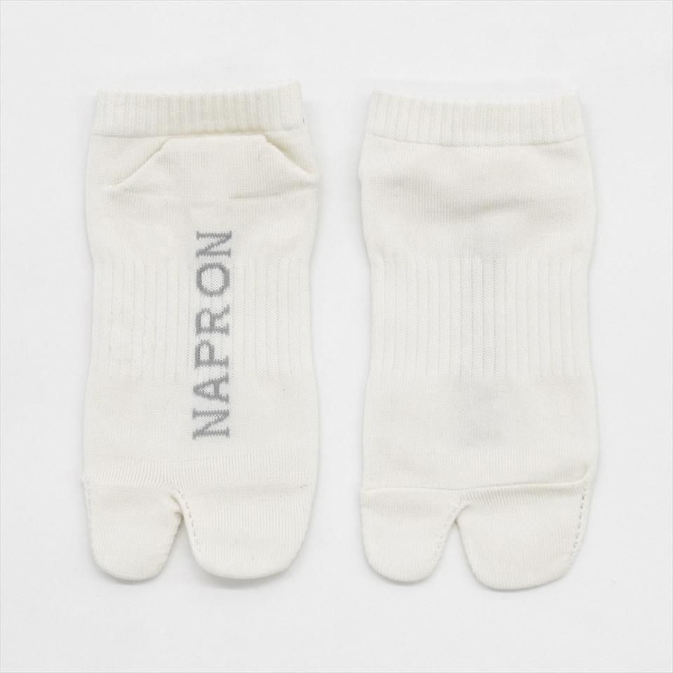 親指と残り4本の指が分かれている足袋型ソックス。股割れがあることで指に力が入りやすいのが足袋の特長。NAPRONオリジナルロゴ入り。