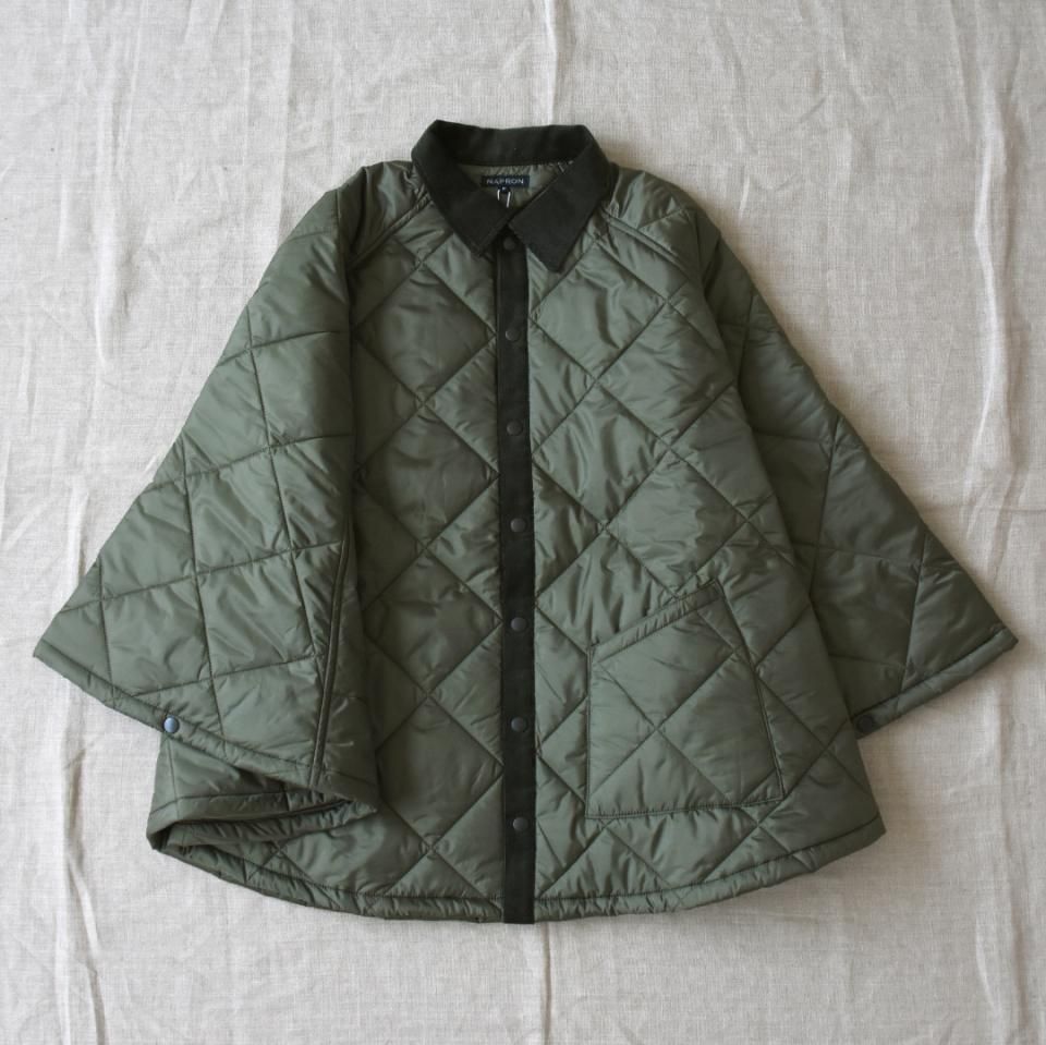 とても軽い中綿キルトを使用したケープ。冬物のコートの上からでもゆったり着られるシルエットで、椅子に座った状態でも、背もたれを包み込んで、太腿がちょうど収まる着丈なので、寒空の下から、デスクワークまで幅広いシーンで活躍します。男女兼用フリーサイズ。