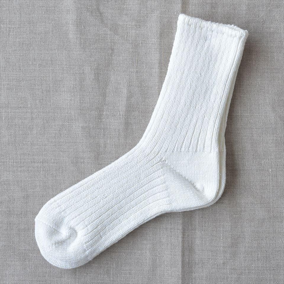 コットン/ヘンプ/アクリルの混合の太めの糸で編み込まれたリブソックス。丈夫で蒸れにくく、締めつけすぎずズレにくいので長時間履いていても疲れにくい靴下。ネップ(糸のかたまり)がなく綺麗めの印象のシンプルな靴下なので、どんな靴にも合わせやすいです。長く履いても穴が開きにくい耐久性があり、アウトドアや作業用靴下として最適。オールシーズン対応の履き心地も良い靴下です。