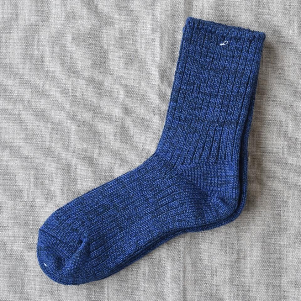 コットン/ヘンプ/アクリルの混合の太めの糸で編み込まれたリブソックス。丈夫で蒸れにくく、締めつけすぎずズレにくいので長時間履いていても疲れにくい靴下。ネップ(糸のかたまり)がなく綺麗めの印象のシンプルな靴下なので、どんな靴にも合わせやすいです。長く履いても穴が開きにくい耐久性があり、アウトドアや作業用靴下として最適。オールシーズン対応の履き心地も良い靴下です。