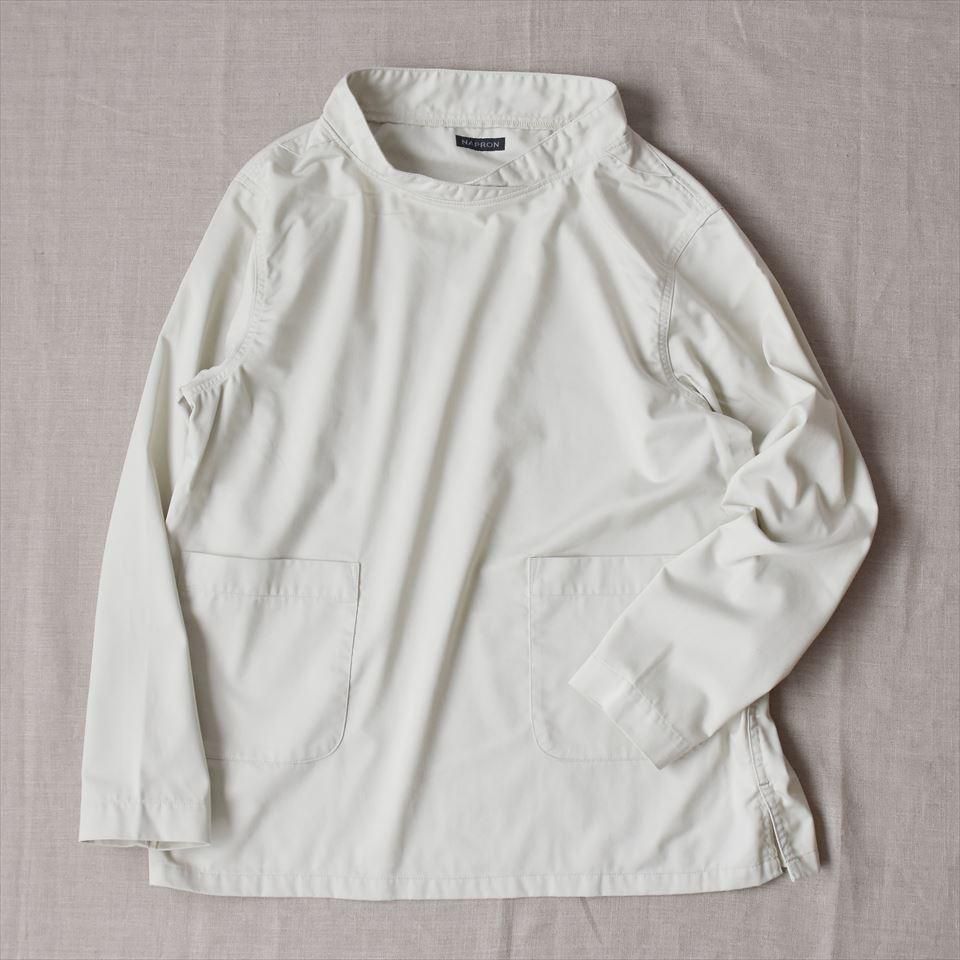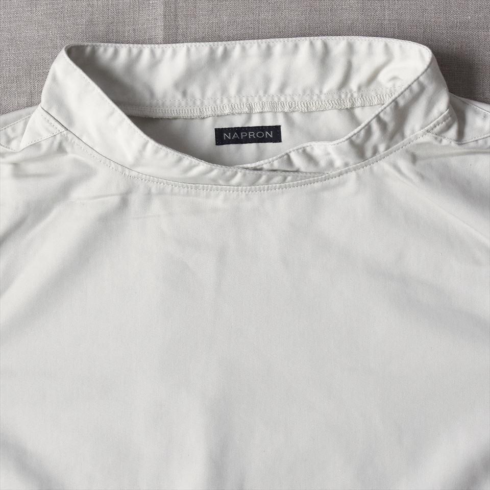 ヴィンテージのフィッシャーマンスモックの着丈を長くしたような一着。広めの襟ぐりに太めのリブを取り付けたような独特な首回り。シャツの上に着る上っ張りのような感覚で、作業着として着るような感覚のウエア。袖口はややテーパーがかかっていますがロールアップしやすい仕様なので、腕の長さやインナーとのバランスなどによって調整ができます。ファッションと作業着の中間着であり、ヴィンテージの要素もあるナプロンらしい一着。