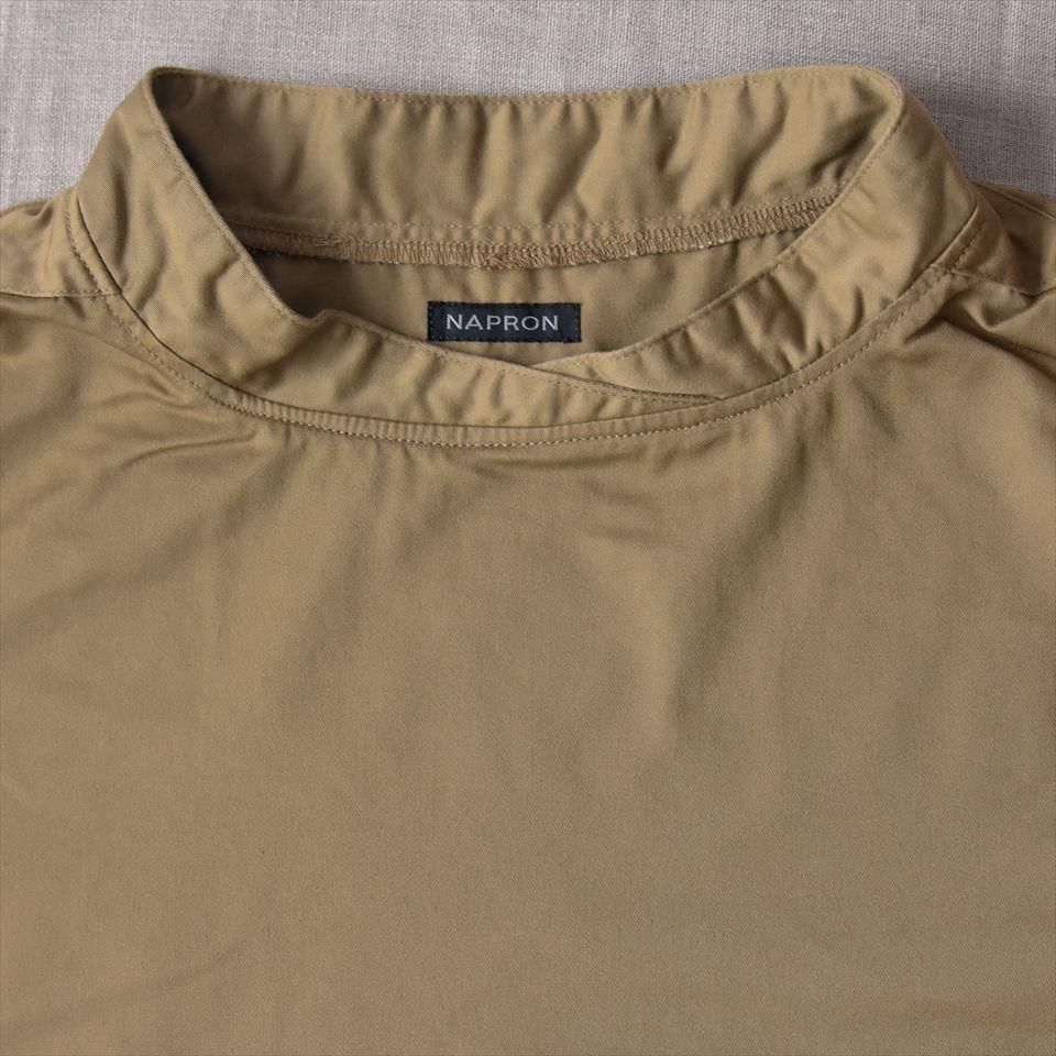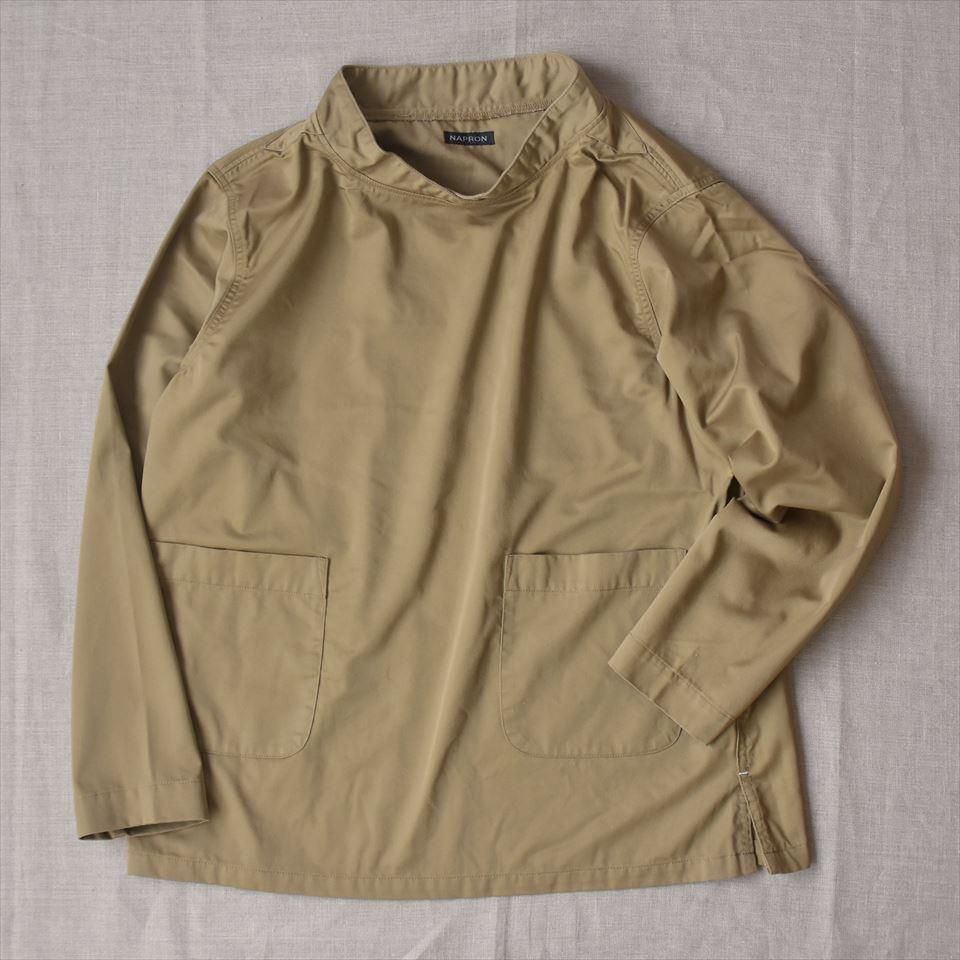ヴィンテージのフィッシャーマンスモックの着丈を長くしたような一着。広めの襟ぐりに太めのリブを取り付けたような独特な首回り。シャツの上に着る上っ張りのような感覚で、作業着として着るような感覚のウエア。袖口はややテーパーがかかっていますがロールアップしやすい仕様なので、腕の長さやインナーとのバランスなどによって調整ができます。ファッションと作業着の中間着であり、ヴィンテージの要素もあるナプロンらしい一着。