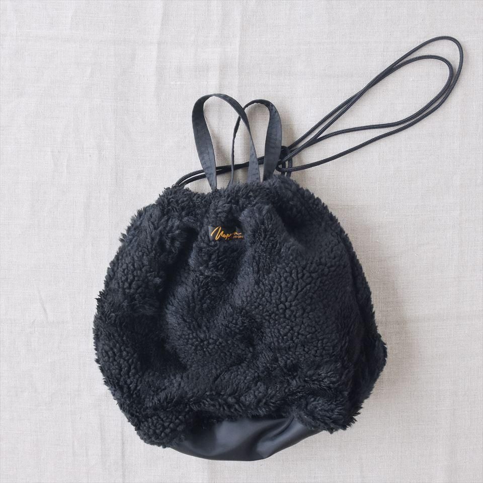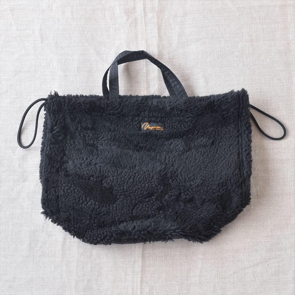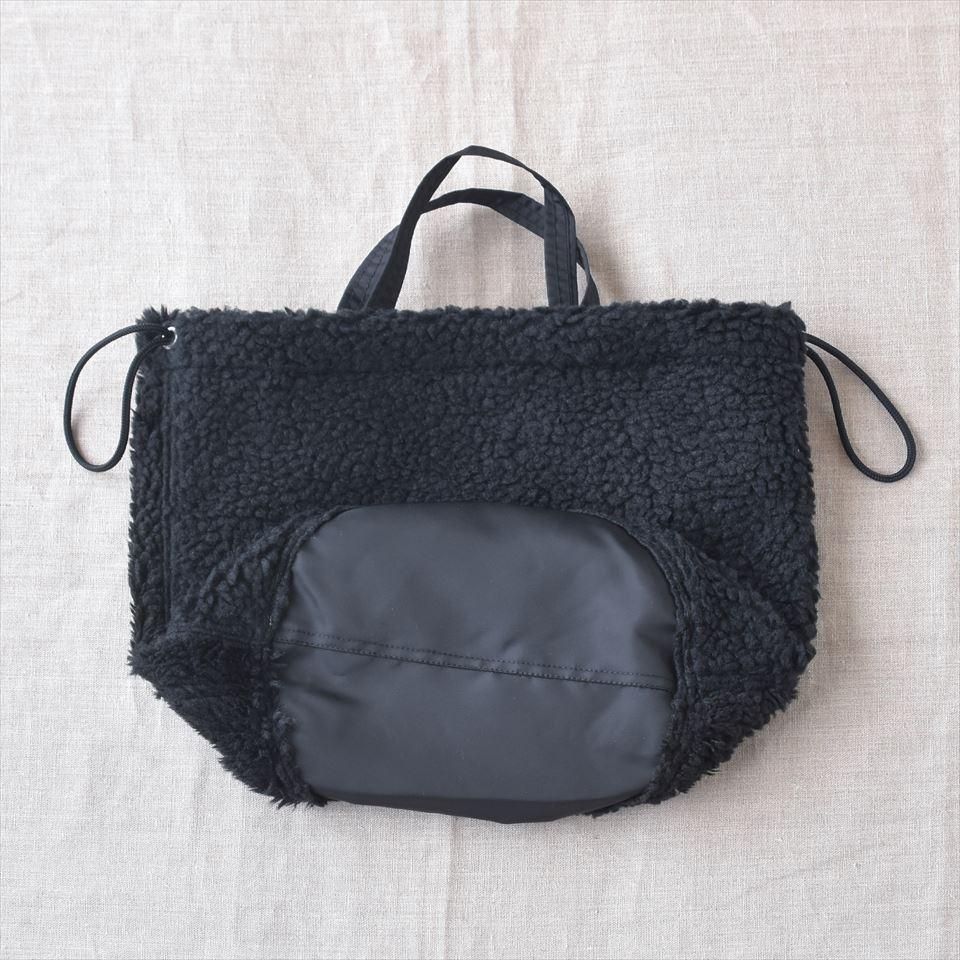 ボリュームがあるボアを使用。よく見ると表は毛足の方向の違いを模様にしたカモフラージュ柄になっています。ショルダーと手提げの2WAYで使えるほか、荷物の量やコーディネートに合わせて、紐の絞り具合でシルエットを変えてお使いいただけます。デイリーバッグとしてお使いいただけるほか、旅行時のバッグインバッグとしてなど様々なシーンでお使いいただけます。