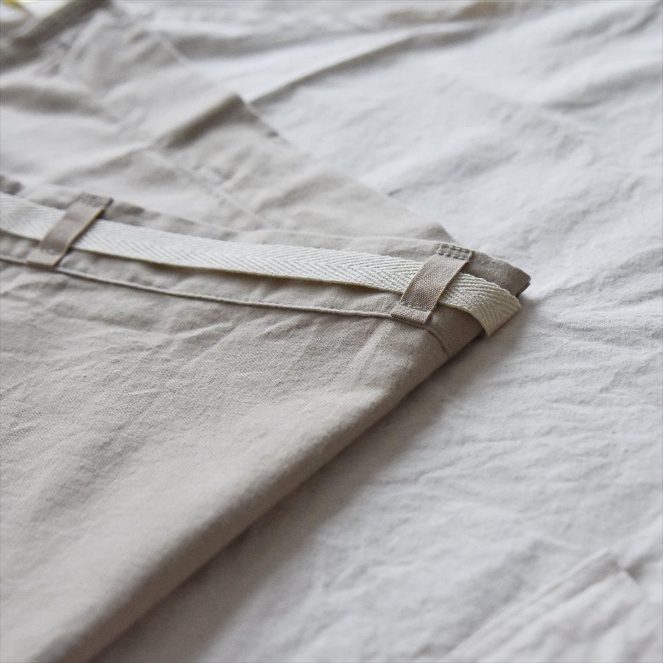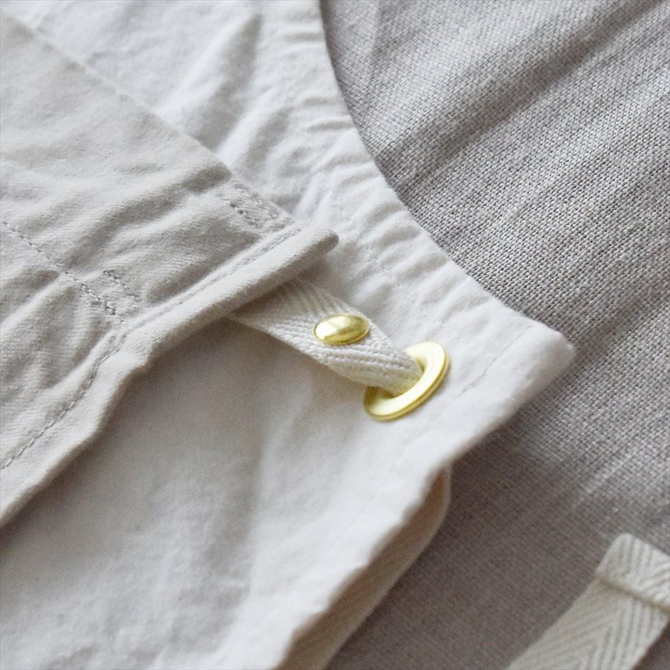 本体に使用されている馬布は、乗馬の際に鞍が滑り落ちにくくするために、鞍と馬の背の間に敷いていた生地。平織の薄手で軽量の生地でありながら密度が高く強度があります。前掛け部のコットンビエラは、フランネルやガーゼのような柔らかく起毛感があることから、前掛け部分は手拭きのようにもお使いいただけます。