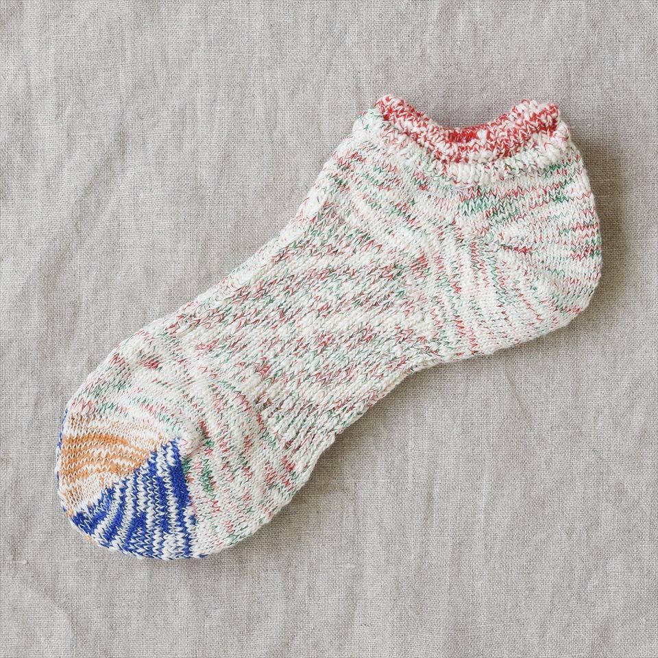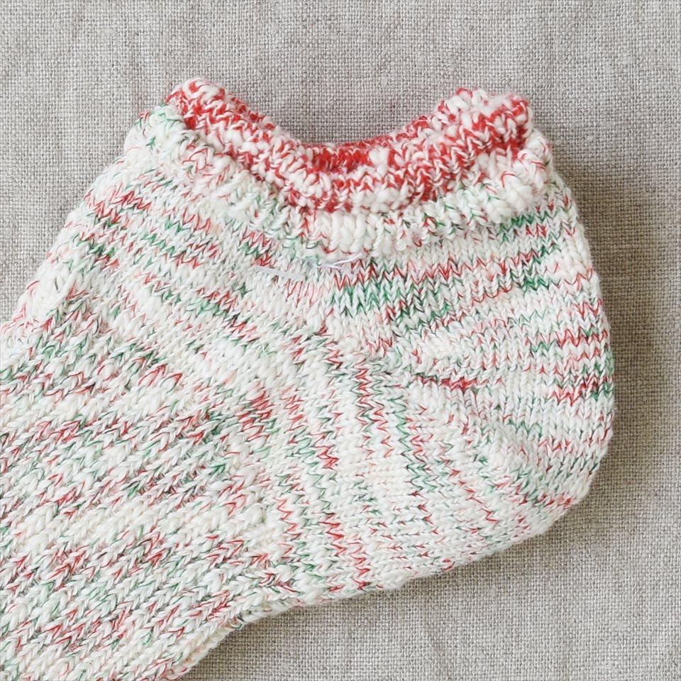 ヘンプ麻混合の太めの糸で編み込まれた肉厚のソックス。丈夫で蒸れにくく、締めつけすぎずズレにくいので長時間履いていても疲れにくい靴下。土踏まずはリブ編みでフィット感があり、履き口のカラー切替が足元のアクセント。ブーツやスニーカー、サンダルなど靴を選ばず合わせやすいデザインです。長く履いても穴が開きにくい耐久性があり、アウトドアや作業用靴下として最適。オールシーズン対応の履き心地も良い靴下です。