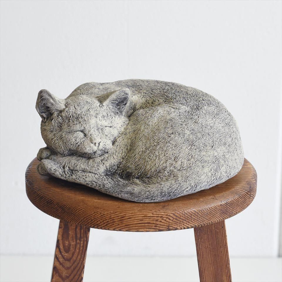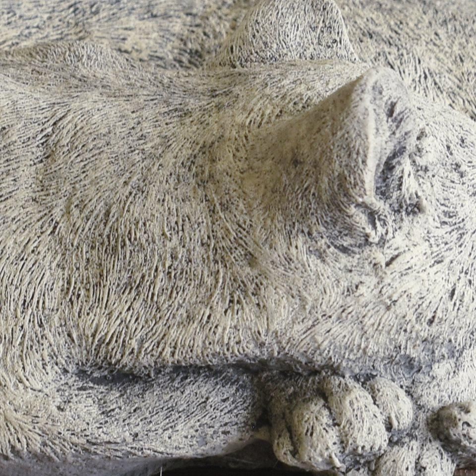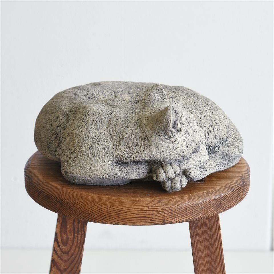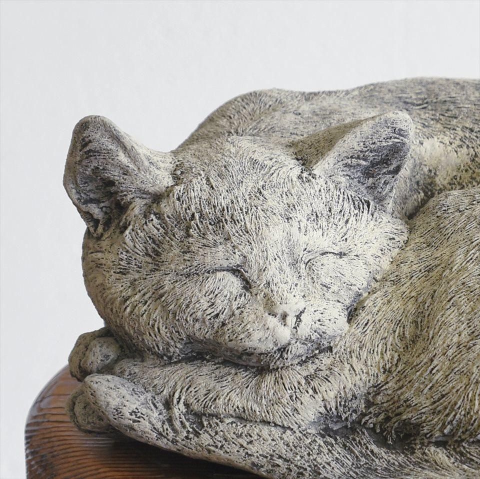 居眠りするトラ猫ストライピー。アンティークモチーフを忠実に再現していて、毛並みなど繊細な細部まで表現されています。樹脂製の廉価品にはない本場のガーデンストーンですので、屋外に置いておくと風合いが増してきます。一般的には庭や玄関のオーナメントとして人気ですが、インテリアとしてとしてもお使いいただけます。