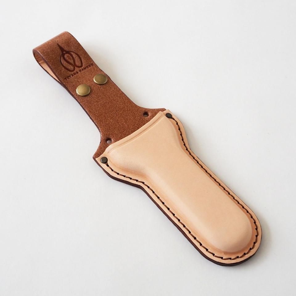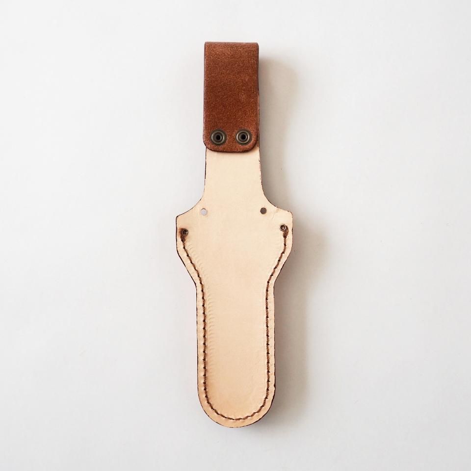 ベルトにサッと取り付けられる革の鋏ケースです。厚手のヌメ革を使っているので、とにかく頑丈。使い込むほどに色味が深まり、自分だけの味わいに育っていきます。また、ベルトを外さなくてもボタンで簡単に装着できるのも嬉しいポイント。さらに、二つの穴に紐を通せば肩掛けポーチとしても使えますし、どこかに固定することも可能。アイデア次第で、いろんな使い方ができる万能ケースです。