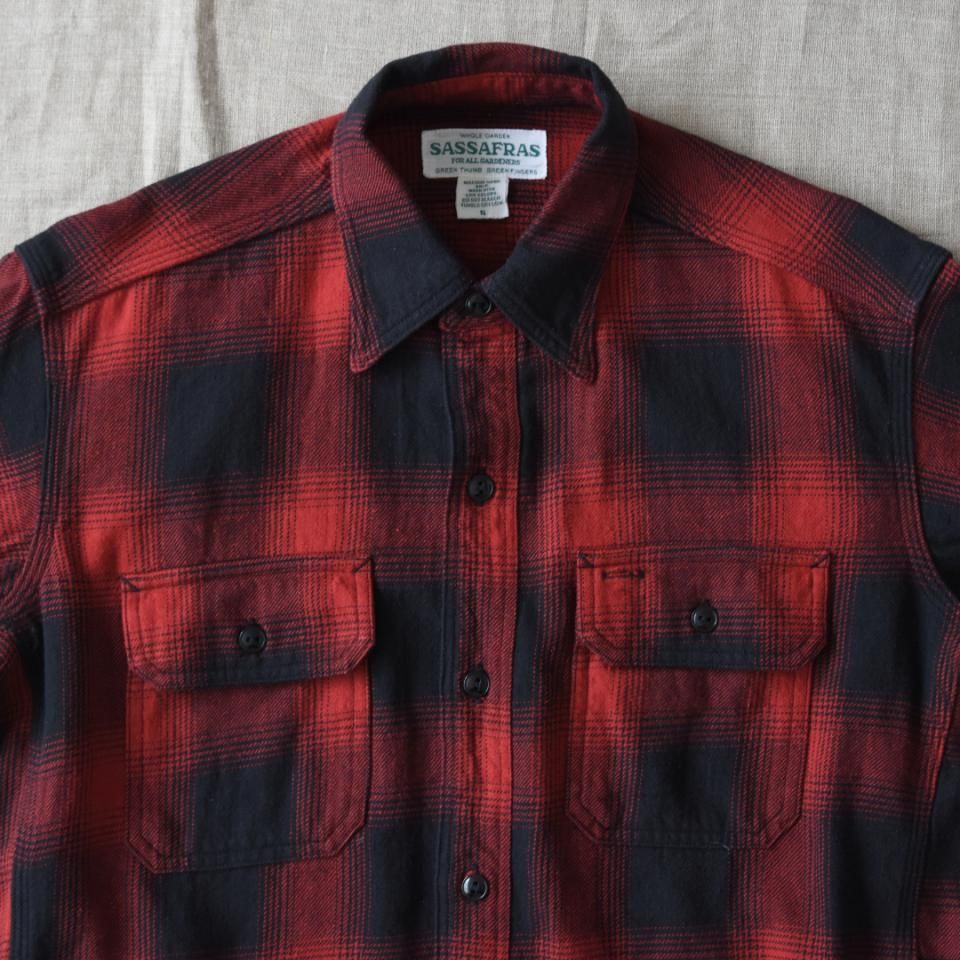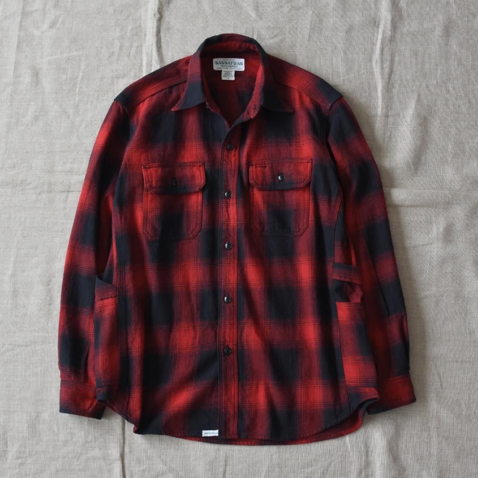 アメカジの名に相応しい厚手の赤オンブレチェック柄シャツ。型もササフラスを代表するガーデナーシャツ。