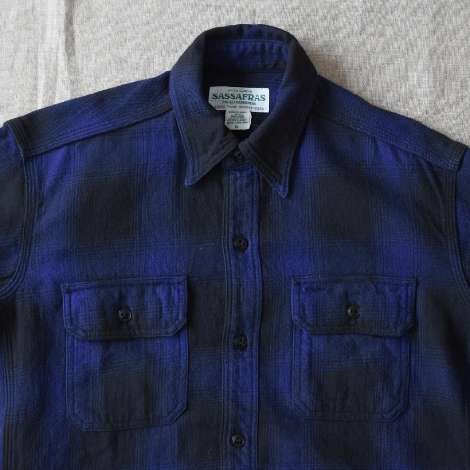 ササフラスの代表的なデザインの一つ、ガーデナーシャツ。ペインターパンツのディテールを取り入れたハンドツールが入るサイズのサイドポケットが特長的。身巾や袖口が広めのデザインなので、ジャケット感覚で羽織れる一着です。様々なタイプのコーディネイトが楽しめるクラシックな色味と配色。綿100%のオンブレチェクは秋冬向けの肉厚ですが重みを感じることもなく、重ね着にも活躍しそうです。