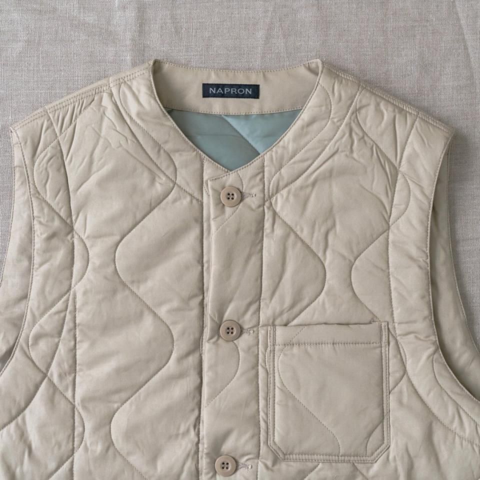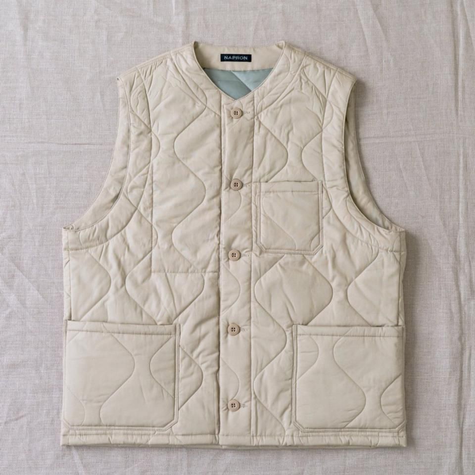 ミリタリーのひょうたんキルトをやや小さめにアレンジした、NAPRONオリジナルキルトのベスト。表地は程よく光沢感のあり、発色が綺麗なブロード生地を採用。着脱のしやすさを考え、滑りの良いポリエステル素材裏地が付いています。