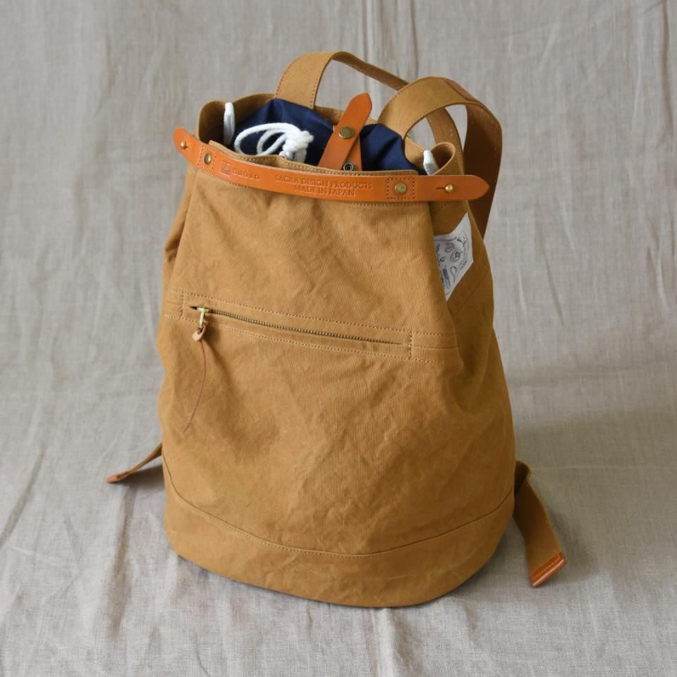 背負い籠(かご)をヒントにした遊び心あるデザインのバッグです。サイドのギボシ金具で鞄口の広さを自由に調整できるので、荷物の量に合わせて使い方をアレンジできます。巾着状の布と内側の革ストラップ付きなので、ギボシを留めなくてもサッと開け閉めが可能。外側にはファスナーポケットも付いていて、スマホや定期など「すぐ取り出したいモノ」もストレスなく収納できます。