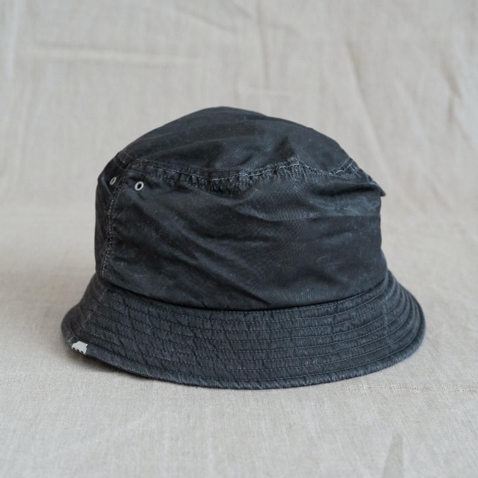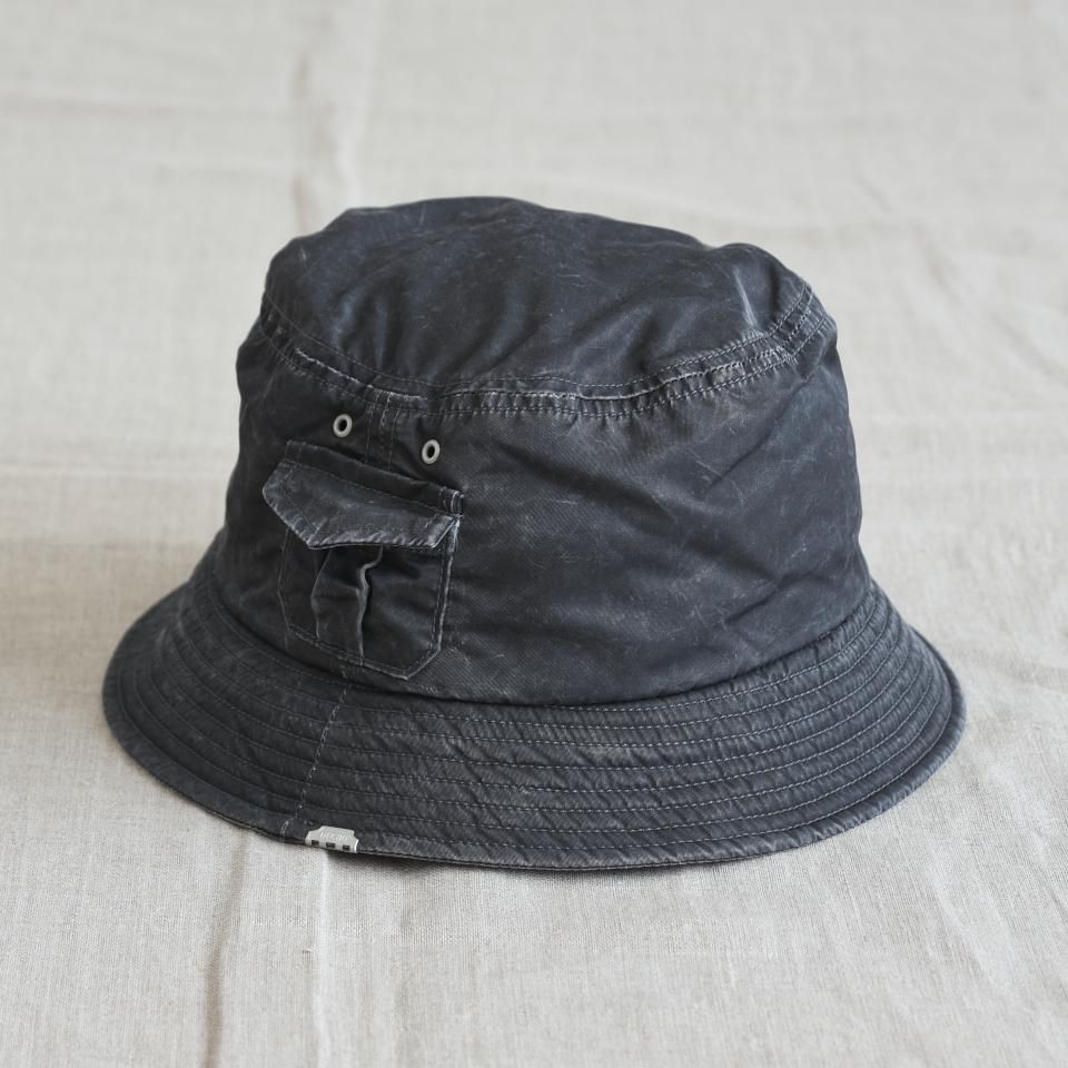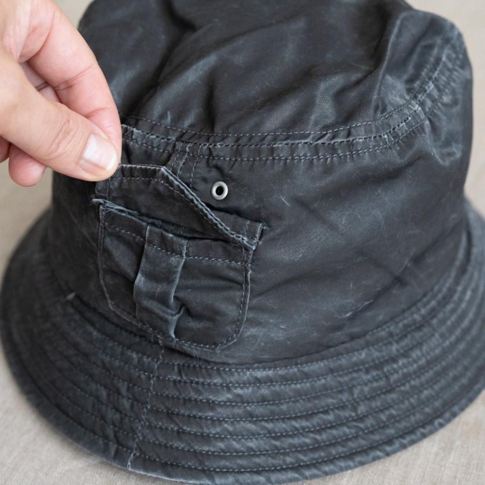 サイドに小さなコンパクトポケットが付いたバケットハット。2サイズ展開。バケットハットです。素材には、MA-1ジャケットで使われていたナイロンツイル生地を採用。その上に顔料コーティングを施し、ヴィンテージ感のある風合いを再現しています。ナイロン素材でありながら、使い込むほどに色が徐々に落ち、経年変化を楽しめるのが特徴です。また、手洗いが可能なので、汗をかいた際は次のケアをおすすめします。汗をかいた場合は手洗いしていただくか、よく絞ったタオルでしっかりと汗をふき取り、完全に乾かしてください。長く使い続けることで、より味わい深い表情が楽しめるハットです。