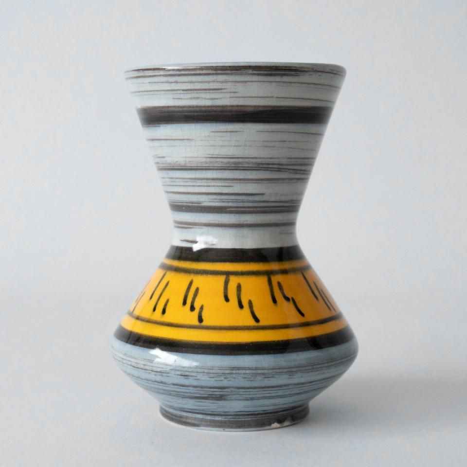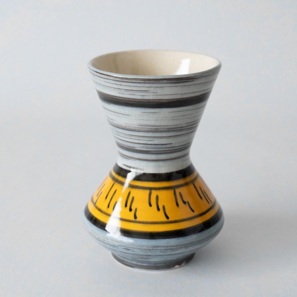 旧西ドイツ時代の1970年代に制作された、Bay(バイ)製のフラワーベース。やや青みがかった白を基調に、鮮やかな黄色の釉薬が際立つ一品。手書きで描かれたデザインや、可愛らしいフォルムも魅力的です。