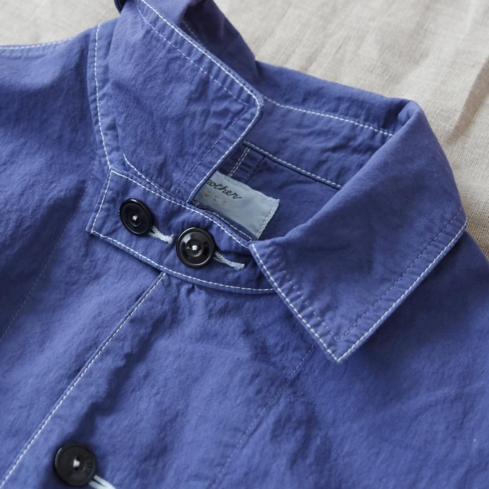 パフューマ―をイメージした製品染めカバーオールジャケット。綿糸とスパン糸を巧みに使い分けることで、ダブルステッチの一方は染まり、もう一方は染まらない独自のコントラストを表現。シングルステッチのように繊細でありながら、浮かび上がる“アタリ感”が、着るほどに味わいを深めていきます。