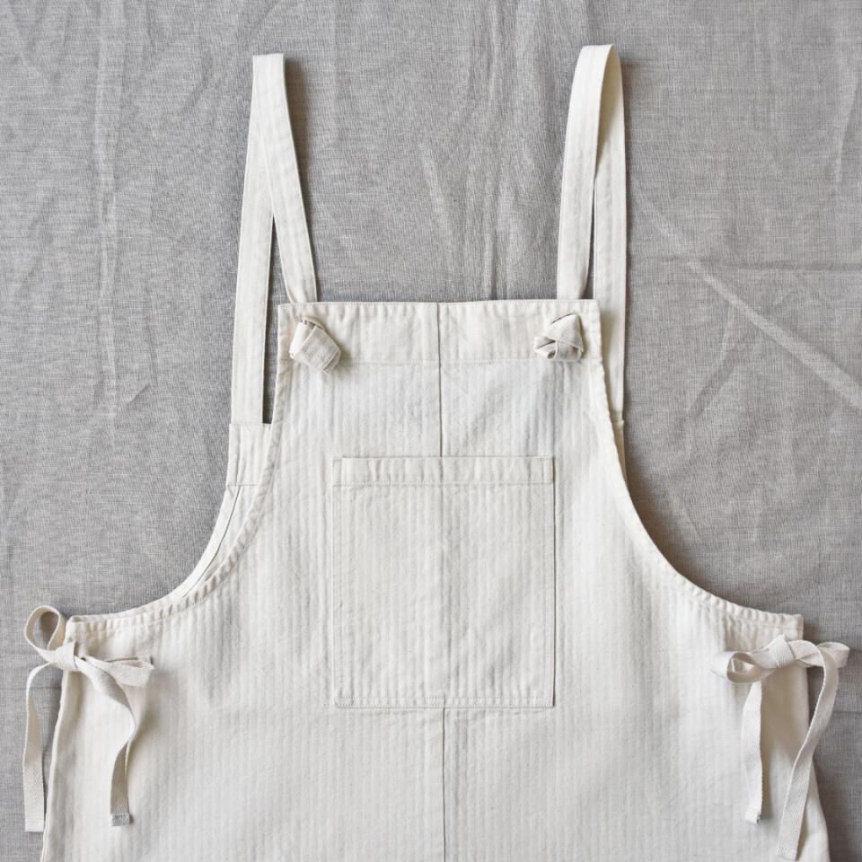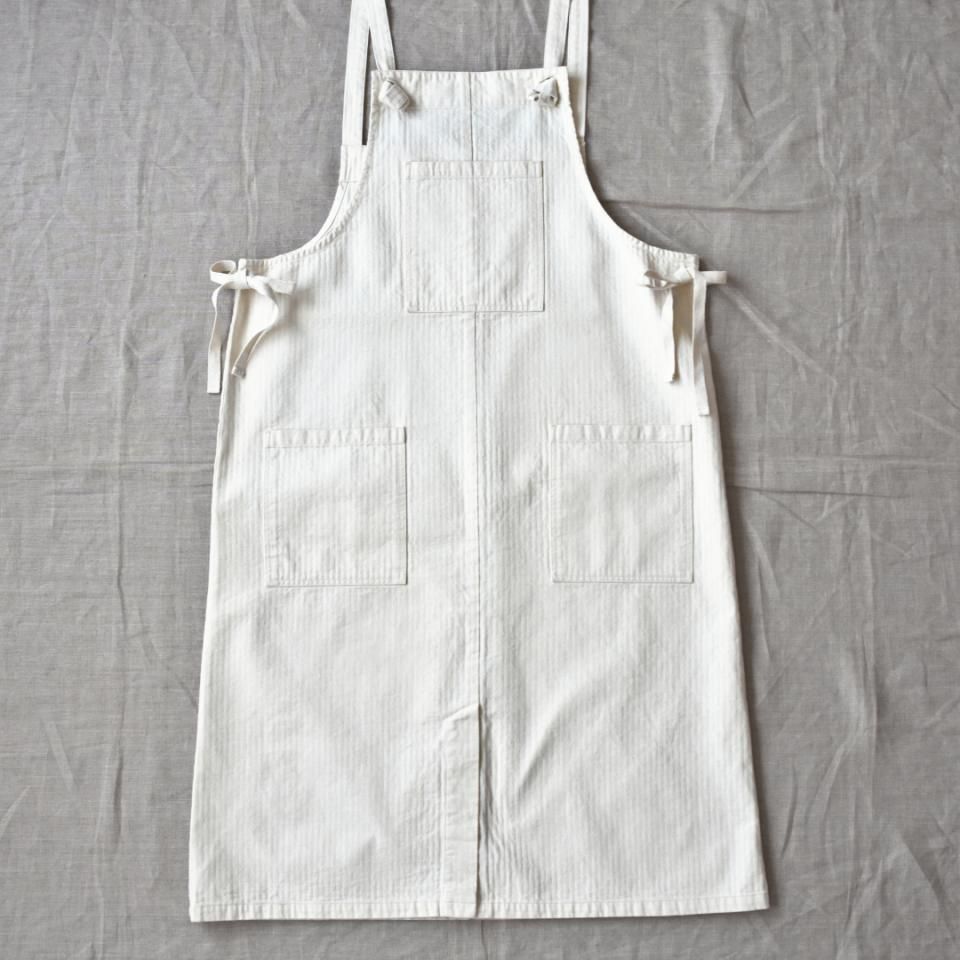 いろんなタイプのインナーに対応するデザインで、ショルダーひもの長さを変えたり、アクセントにもなっているサイドのヘリンボーンテープを結ぶことでウエストサイズの調整も可能です。生地は、ワークウエアやミリタリーウェアを代表する生地の一つ、コットンヘリンボーン生地。洗い込むことでさらに風合いが増すので、経年変化もお楽しみください。