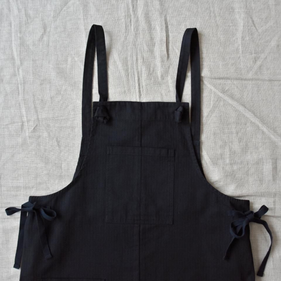 いろんなタイプのインナーに対応するデザインで、ショルダーひもの長さを変えたり、アクセントにもなっているサイドのヘリンボーンテープを結ぶことでウエストサイズの調整も可能です。生地は、ワークウエアやミリタリーウェアを代表する生地の一つ、コットンヘリンボーン生地。洗い込むことでさらに風合いが増すので、経年変化もお楽しみください。