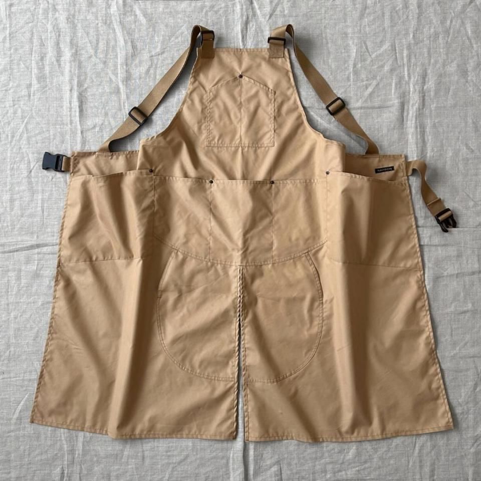 ブランド定番のエプロン「SPLIT APRON」を元に、タクティカルギアの要素を取り入れたエプロン。胸元や腹部、腰回りや膝元の当て布にまでもポケットが付いていて、膝部分のポケットは、鍋つかみとしても機能します。膝下部分が割れているため、しゃがみ作業や階段の上り下りがしやすく、ワンピースやオーバーオールのようにコーディネートに取り入れられるエプロンです。コットン/ナイロンは軽量で、ショルダー紐の面積も広く、長時間着用も疲れにくい仕様です。