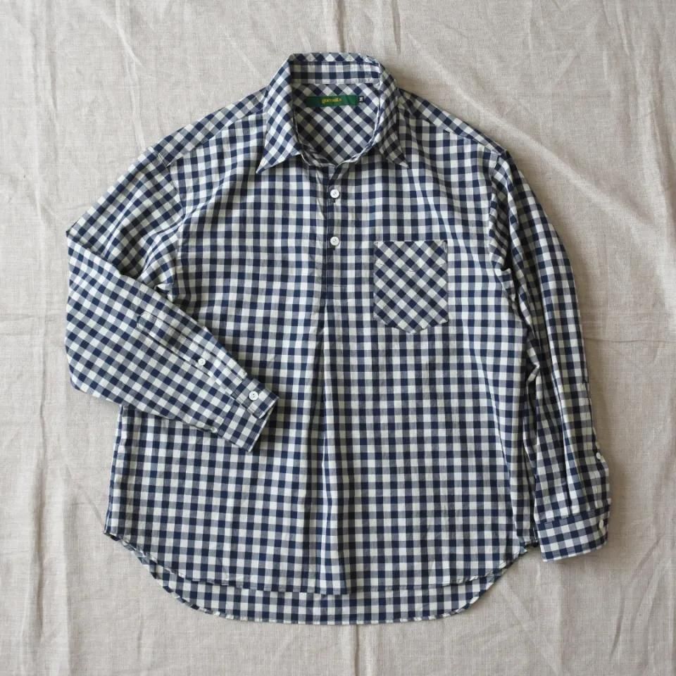 真夏でも着ることができる薄手でのコットン。1センチ角のナチュラルとネイビーのギンガムチェック。白地よりも落ち着いた印象。アイロンでしっかりシワを伸ばせる素材感で、綺麗めに着ても良いですし、洗いざらしをラフに着ても様になる生地です。