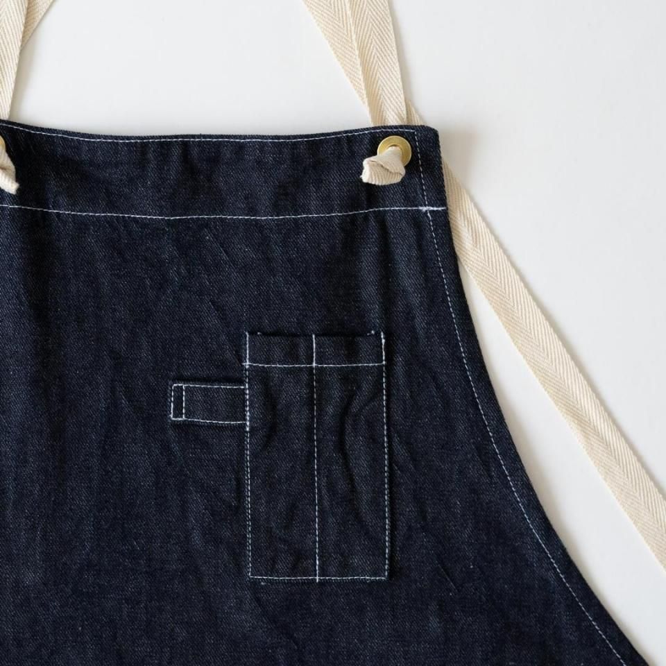 大きなフラップポケットと、切り替えが特徴のロングエプロン。フラップがあるでゴミや土なども入りにくくなります。右側のフラップポケットには、インディゴ染めした刺し子生地を使用した小さなポケットも付いています。胸元には2本入るペンポケットと、メガネやヘアクリップなどを掛けれるループが付いています。