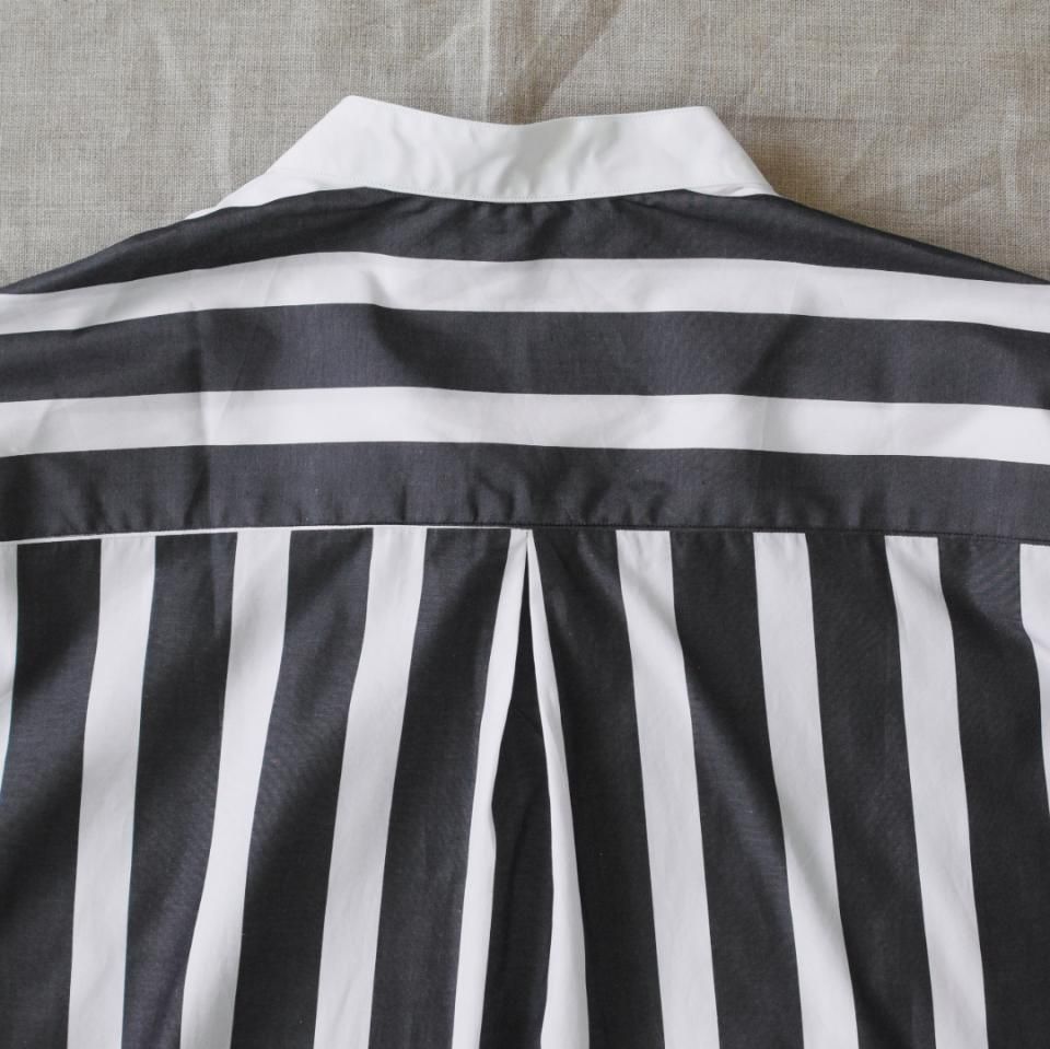細番手の糸を密度深く織りあげ、滑らかな肌触りに仕上げています。3cmの太めのストライプでカラー部分は無地ホワイト仕上げ。