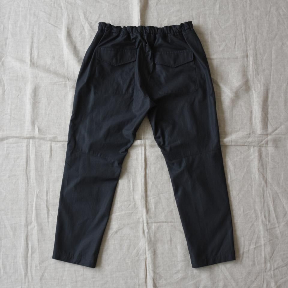 ブランド定番のドローコードパンツの。春夏秋3シーズン着用できる生地感の綿麻バックサテンを使用。膝立体裁断による綺麗なシルエットで、細身にもかかわらず動きやすいスポーティーな印象の一着。ウエストはゴムと20mmベルトコード仕上げ。膝は前振りの立体裁断。バックは左右にフラップ付きのポケット。ヒップ周りゆとりあり、裾にかけてテーパードした細身のシルエットになります。化繊が苦手だけどアウトドア/スポーツ寄りで天然素材の表情があるパンツをお探しの方には特におすすめです。