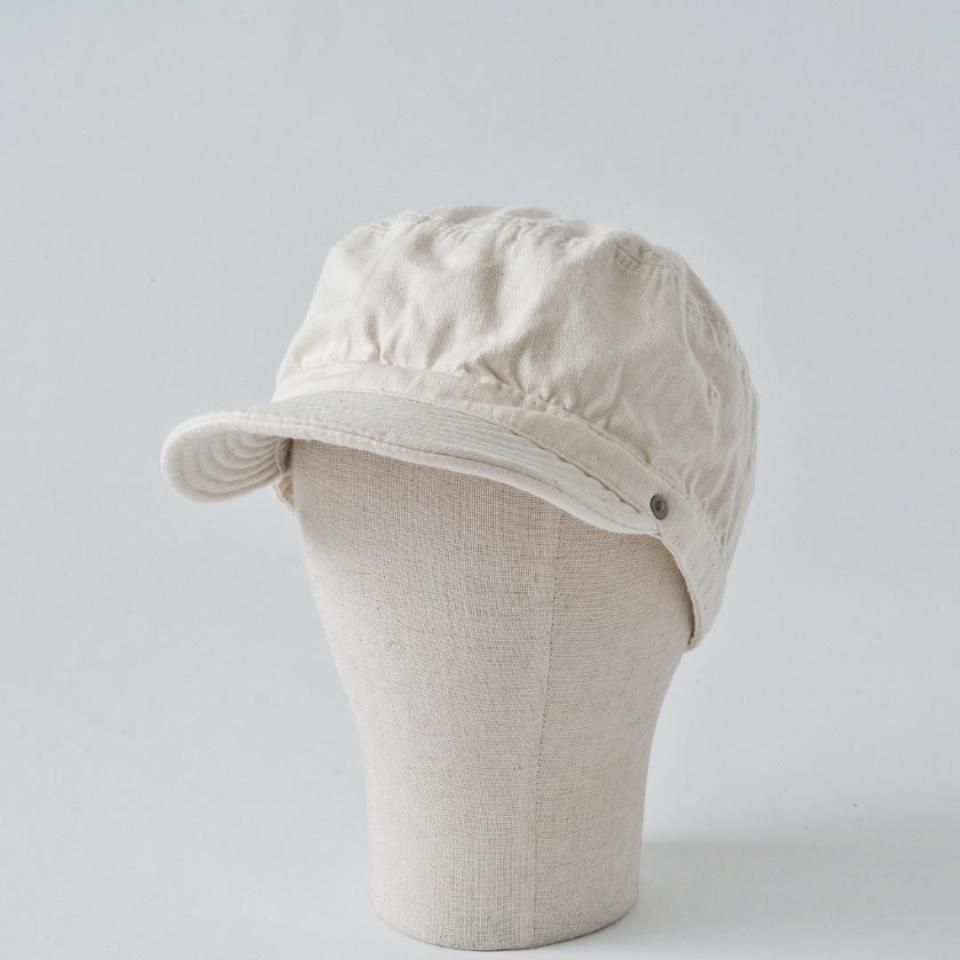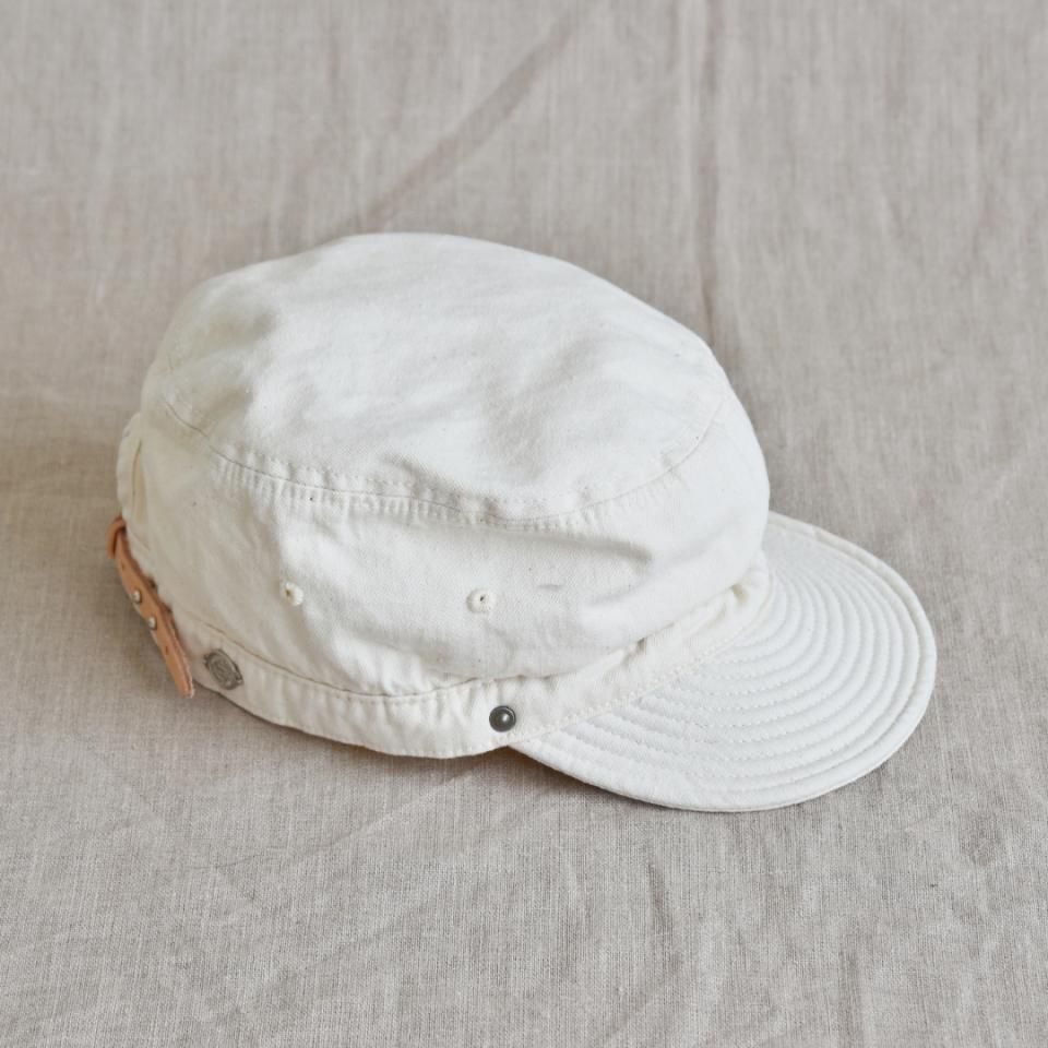 ポーターやサービスマンが被っている帽子をモチーフにデザインされていて、どんなコーディネイトにもマッチする万能なシルエットのワークキャップ。後部に革製バックルが付いているため、頭のサイズや性別を問わず着用可能です。バックルは取り外しができるので洗濯も可能です。