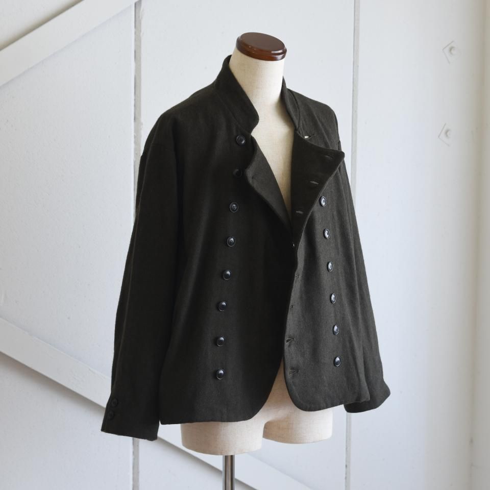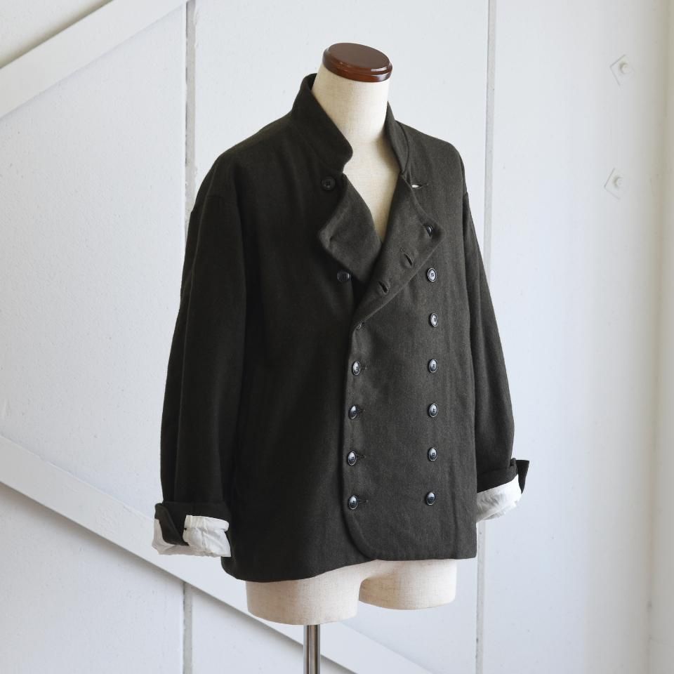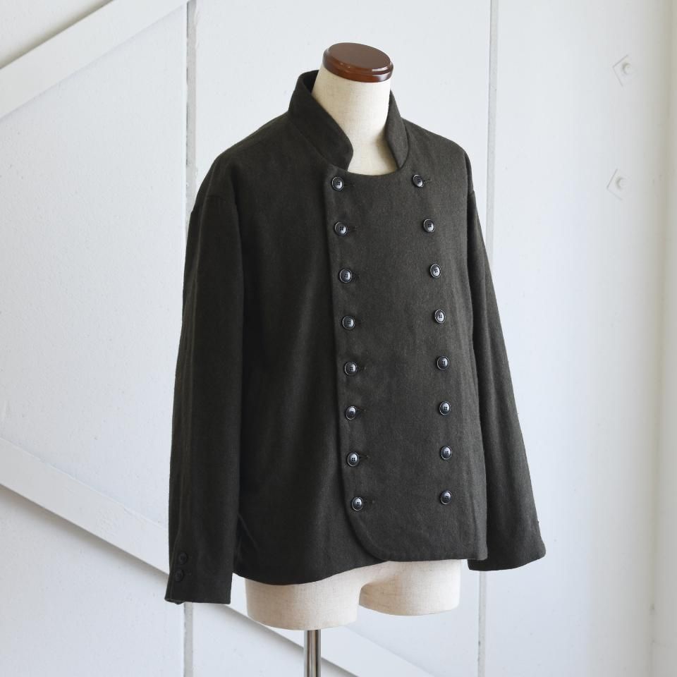 bio kochシリーズのクラシックなウールジャケット。一見かっちりとした印象になりやすいダブルジャケットですが、こちらはボックスシルエットと首まわりのデザインによって、ほどよくラフな雰囲気に仕上がっています。また、ボタンの留め方をアレンジすることで、さまざまな着こなしを楽しめるのも魅力です。生地の質感を引き出すために軽く洗いをかけてから仕上げてあります。クラシックでありながら、日常に取り入れやすい一着となっています。