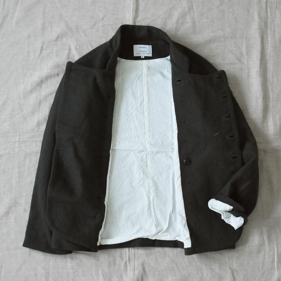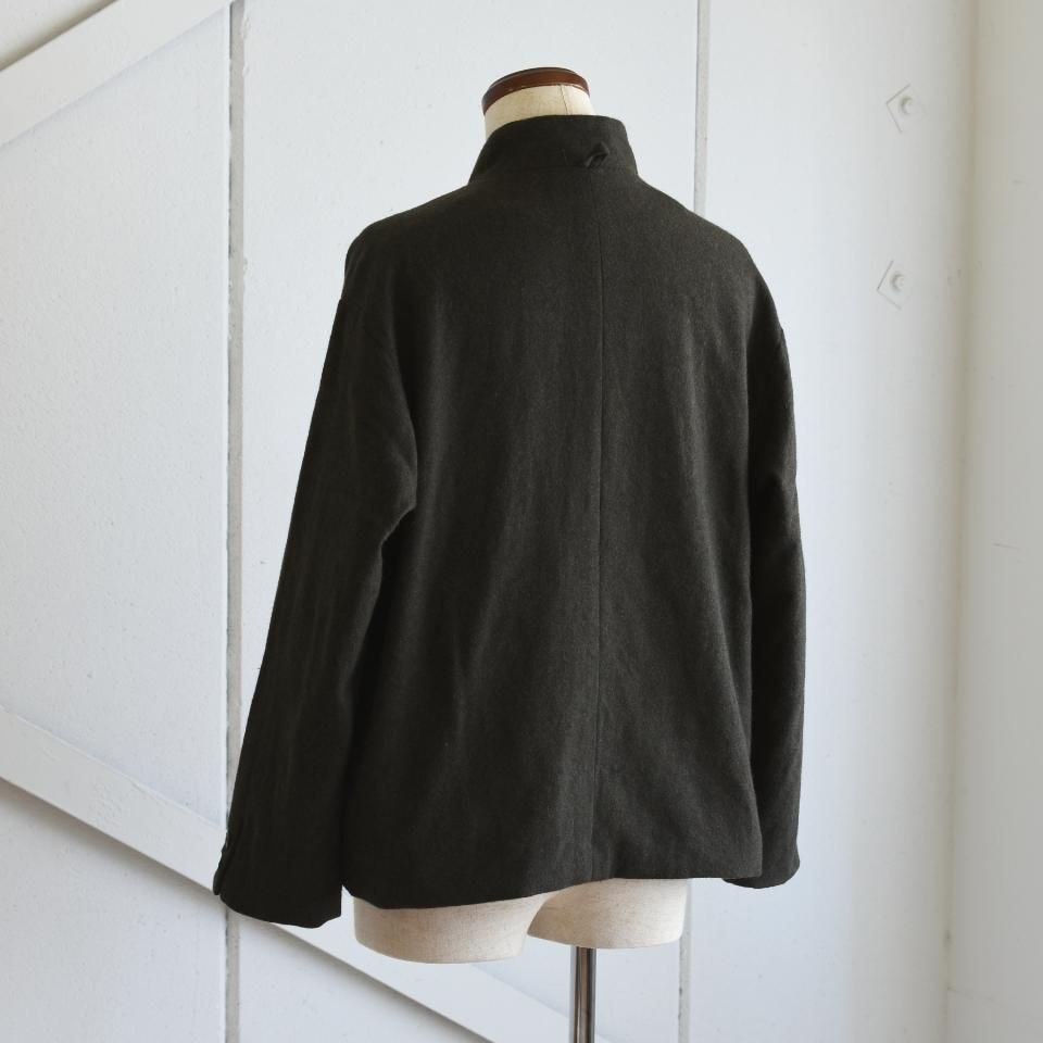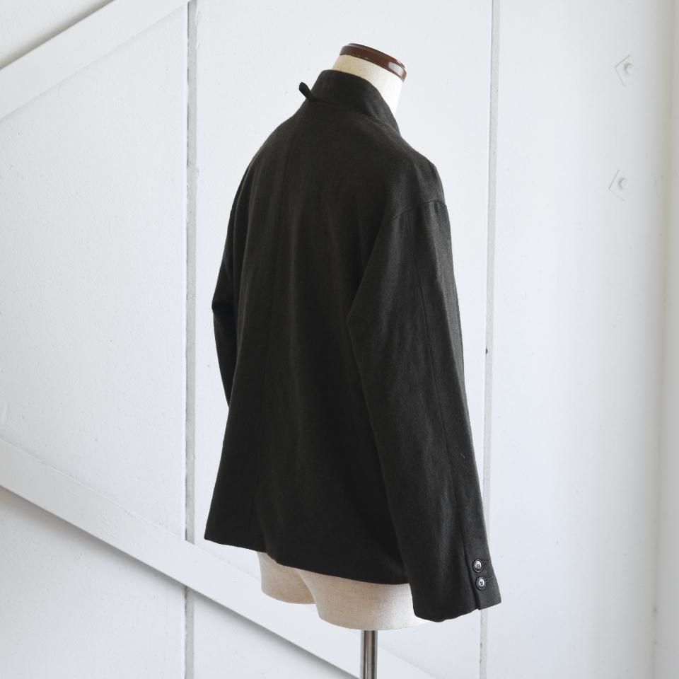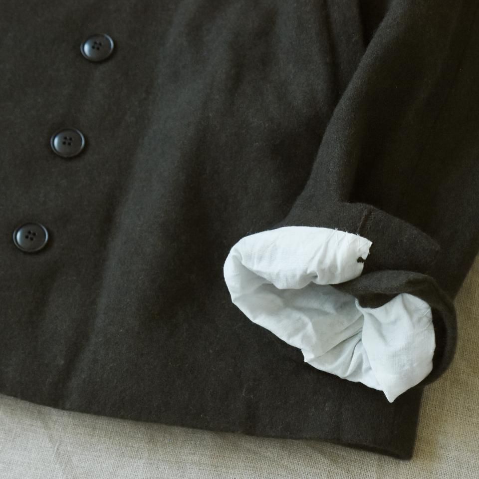 bio kochシリーズのクラシックなウールジャケット。一見かっちりとした印象になりやすいダブルジャケットですが、こちらはボックスシルエットと首まわりのデザインによって、ほどよくラフな雰囲気に仕上がっています。また、ボタンの留め方をアレンジすることで、さまざまな着こなしを楽しめるのも魅力です。生地の質感を引き出すために軽く洗いをかけてから仕上げてあります。クラシックでありながら、日常に取り入れやすい一着となっています。