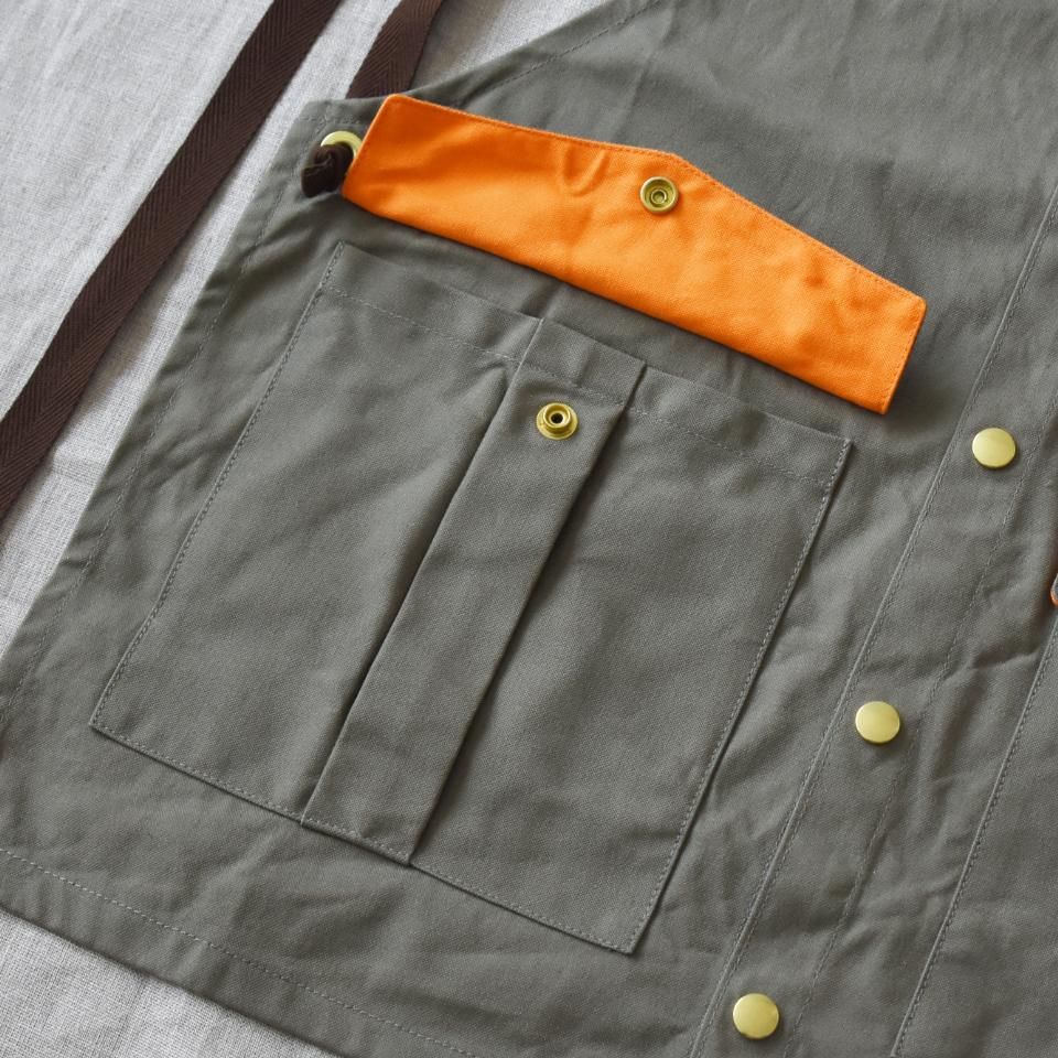 マウンテンパーカーのポケットをモチーフに、大きなポケットを配したショート丈エプロン。フラップ裏のハンターをイメージしたオレンジカラーがアクセント特徴的。シャツやジャケットを羽織った時に使いやすようにデザインされています。胸元にペン挿しポケットが二つ、胸ポケット下には、バードコールを吊り下げるモチープのリングが付いています。