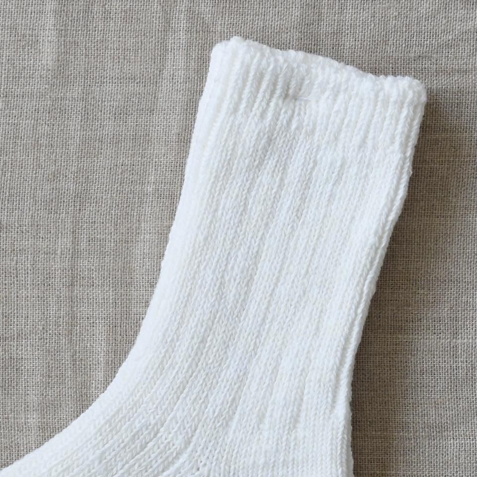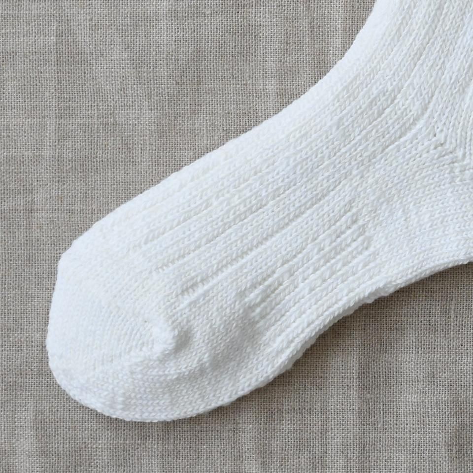 コットン/ヘンプの混合の太めの糸で編み込まれたリブソックス。丈夫で蒸れにくく、締めつけすぎずズレにくいので長時間履いていても疲れにくい靴下。ネップ(糸のかたまり)がなく綺麗めの印象のシンプルな靴下なので、どんな靴にも合わせやすいです。長く履いても穴が開きにくい耐久性があり、アウトドアや作業用靴下として最適。オールシーズン対応の履き心地も良い靴下です。
