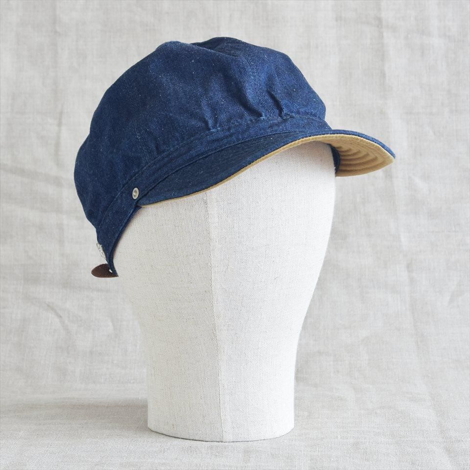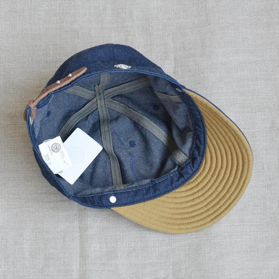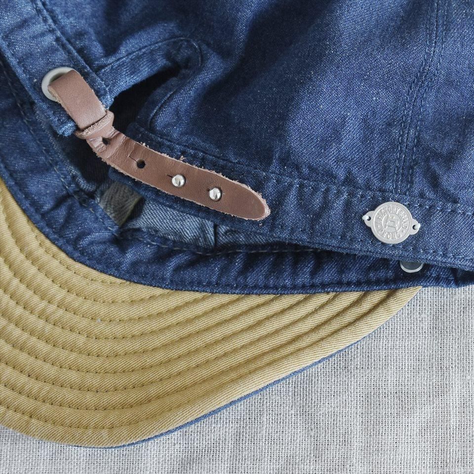 定番のコメキャップ。深めのシルエットで男女問わず被っていただけます。腰帯があることで程よくフィット感があります。10オンスネップペインターデニムを使用。経糸はインディゴロープ染色を用いて染めています。通常のデニムタイプより薄めの色感で汚れが目立ちにくいのが特長。後部のフックでサイズ調整が可能です。革フックは取り外して洗濯することができます。
