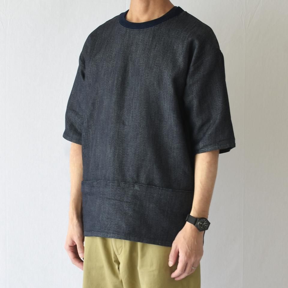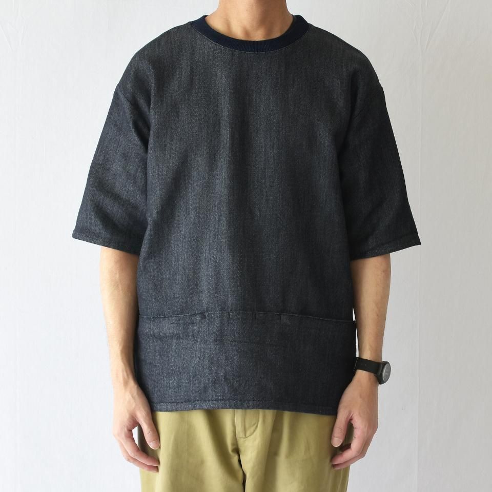 表はデニム、身につけるとスウェットのような肌触りで1枚でも着用可能なフェイクスウェットデニム。デニムに、ペンキや、画材の自然な汚れはよく映える..... Dirt’s Painting (汚れは絵画だ)という考えから、着心地、作業着の機能としてはもちろん、汚して尚良いという観点からこの生地を採用。表からみえないようにつけられた安心感のあるファスナー口のwallet pockets。パスポート、カードなどの収納にもつかえます。中央にペン挿し三箇所あり。前後ろの段差は、ポケットの重みによる全体のバランスの崩れを良くするためのものです。襟ぐりはバインダーのような仕様で、フライス地による三角マチは着脱の為のディティール。フェイクスウェットデニムは二重織りによって軽く、伸縮性、ソフトな風合いが特徴。