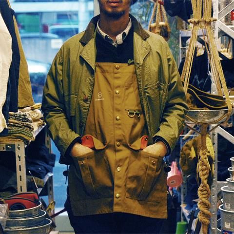 マウンテンパーカーのポケットをモチーフに、大きなポケットを配したショート丈エプロン。