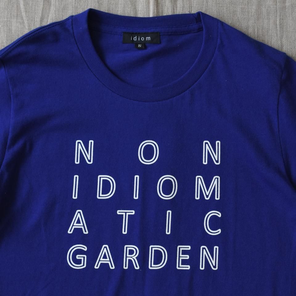 庭いじり園芸ユニットidiom(イディオム)のテーマ「NON IDIOMATIC GARDEN」Tシャツ。流儀や形式にいっさいとらわれることなく、庭を愛するすべての人に。カラー配色は、「月光の庭」と称される東山慈照寺(銀閣寺)の白川砂の庭をイメージ。月明かりを反射させ庭を愛でるというわびさびをもとに、夜空のナイトブルーと白砂の配色。男女兼用ユニセックス型。