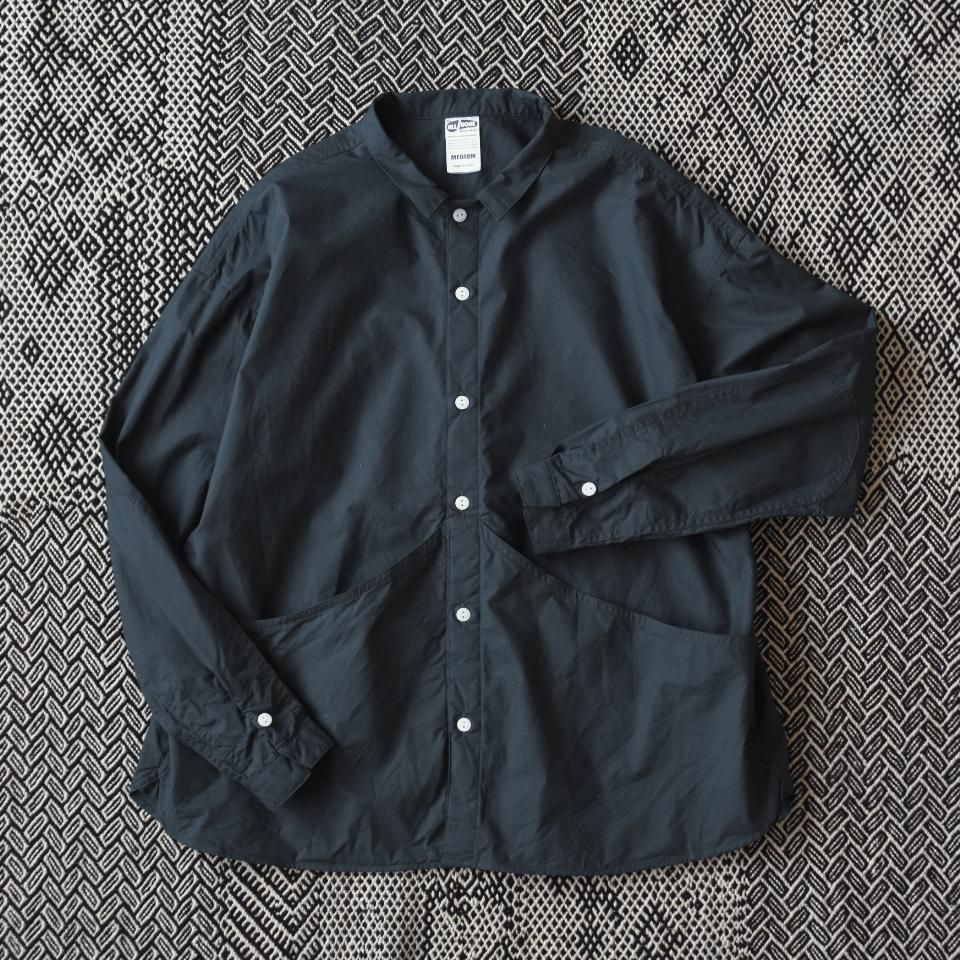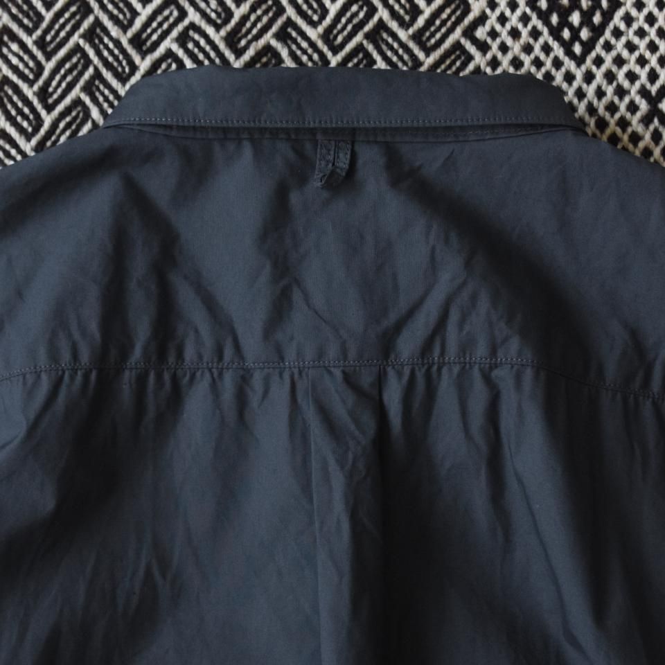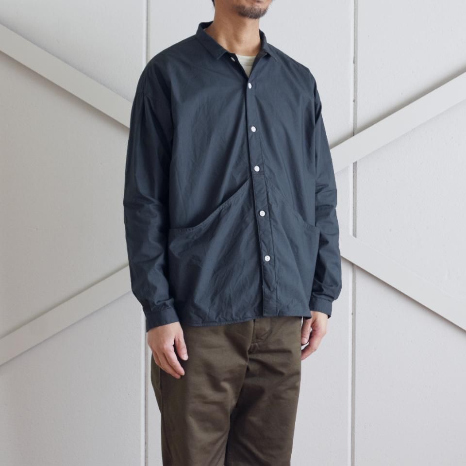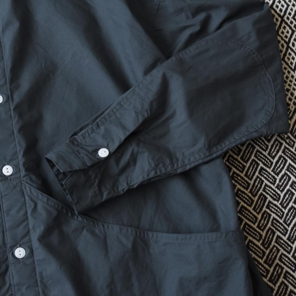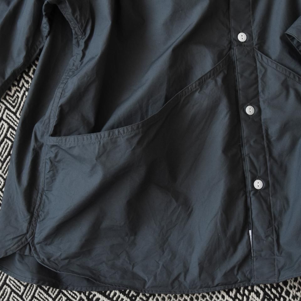 お腹周りの大きなポケットが特徴的なブランド定番のシャツ。マイナーチェンジを繰り返し制作していることから「GROWTH(成長)」と名付けられています。オールシーズン対応できる生地の厚のタイプライター生地。ドロップショルダーで、小さな襟、台襟がのないゆるめの首回り、Aラインのシルエット、後ろ身頃にたっぷりと分量があり、ゆったりとした着心地です。カフボタンない袖口ですが広がりダレることがなく、且つ腕まくりがしやすいデザインです。シャツとしてはもちろん、軽い羽織としても使えます。女性にもご愛用者が多く、男女問わず不思議としっくりくるロングセラーの一着です。