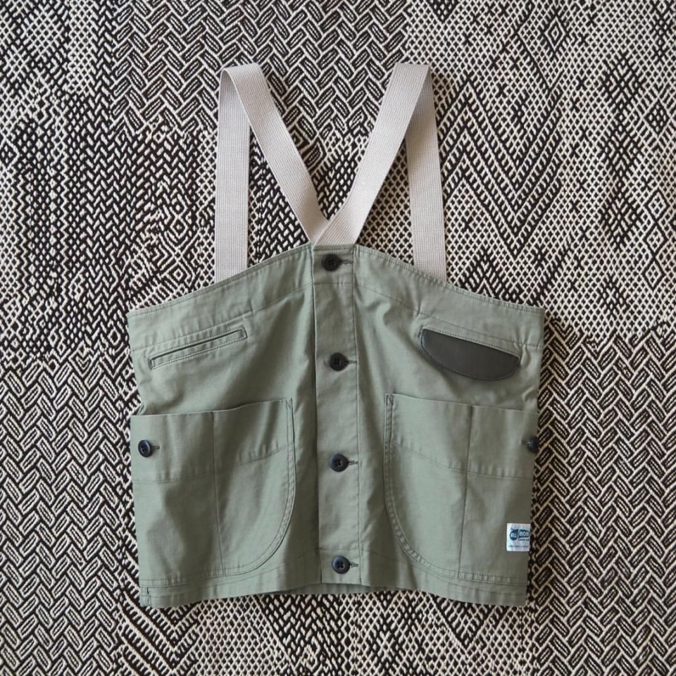 ALEXANDER LEE CHANGのデザイン提供でコラボ制作したベスト型エプロン。バックサテン生地。※ 着用モデル:158cm、Sサイズ着用(同型色違いグレーの着用画像を掲載しています)