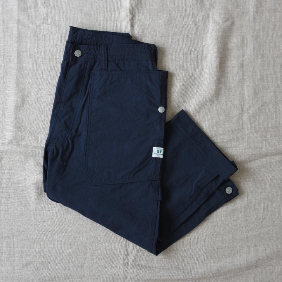 ササフラス定番型フォールリーフにペインターパンツのディテールを加えた七分丈。ナイロンオックス生地。