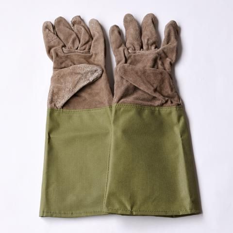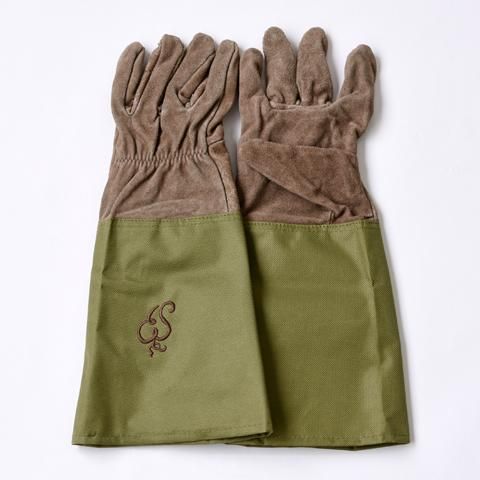 ヌバック(起毛させた本革)のグローブ。柔らかく滑りにくいのが特長。ポリエステルの長めの袖は、腕まで覆うので水やトゲに対策としてもお勧めです。グローブサイズ7程度。一般的な手のサイズの方向き。華奢で小さな手の方には大きめで、分厚く指が長い手の方には小さめのサイズ感です。フランス語で家庭菜園の秘訣を意味する、Secret Du Potage(セクレドゥポタジェ)シリーズ。
