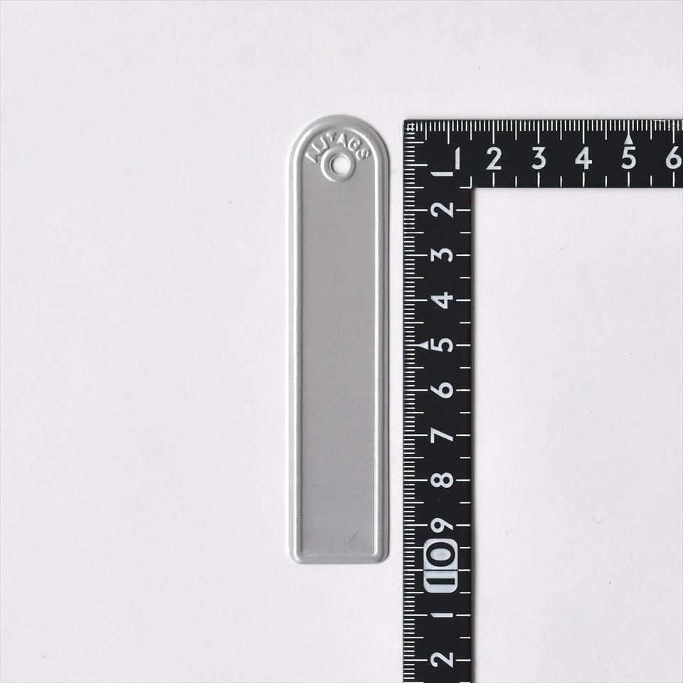 耐腐食エッチング処理とアルマイト加工が施されたアルミタグ。5枚セット。パンチングによる刻印やクギなどで名入れをすると消えることはありません。鉛筆で書く場合は、消しゴムで消して書き換えることができます。メーカー推奨の鉛筆の種類はHBで、特殊加工により経年(目安として1年程度)で消えにくくなります。