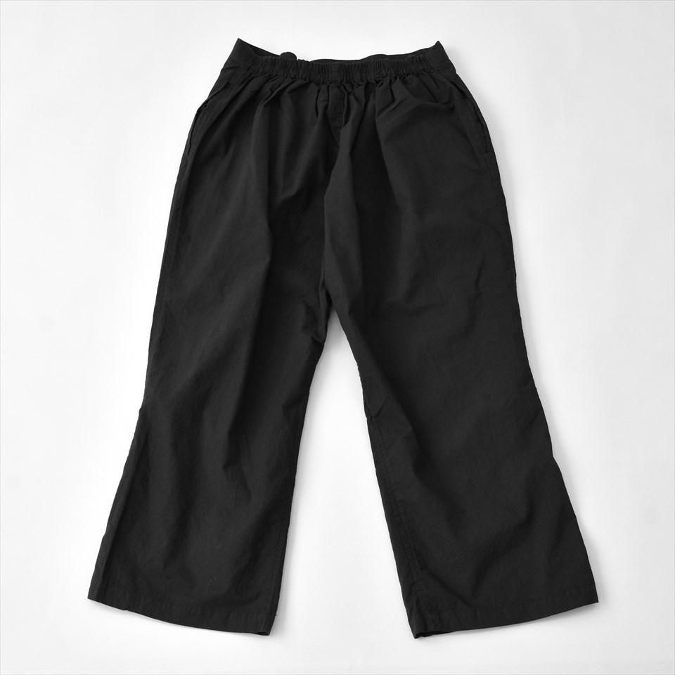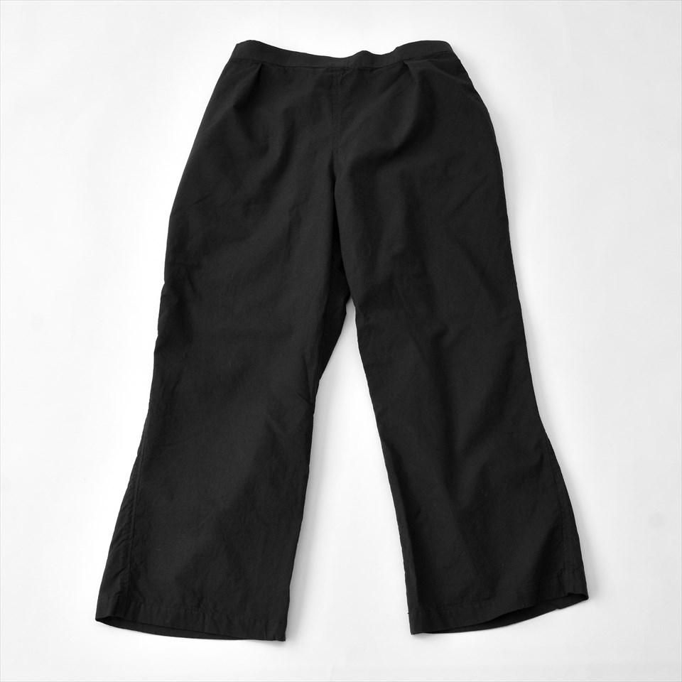 ウエスト後ろがゴム仕様の緩やかなクロップド丈のフレアパンツ。ハリコシが少なく、滑らかで柔らかい履き心地抜群のインドコットン生地を後染めしています。両サイドにスリットポケットが付いています。ワンタックでドレープがかかり裾はフレアでやや広がりがあります。通気性もよく真夏でも快適に過ごせる一着です。