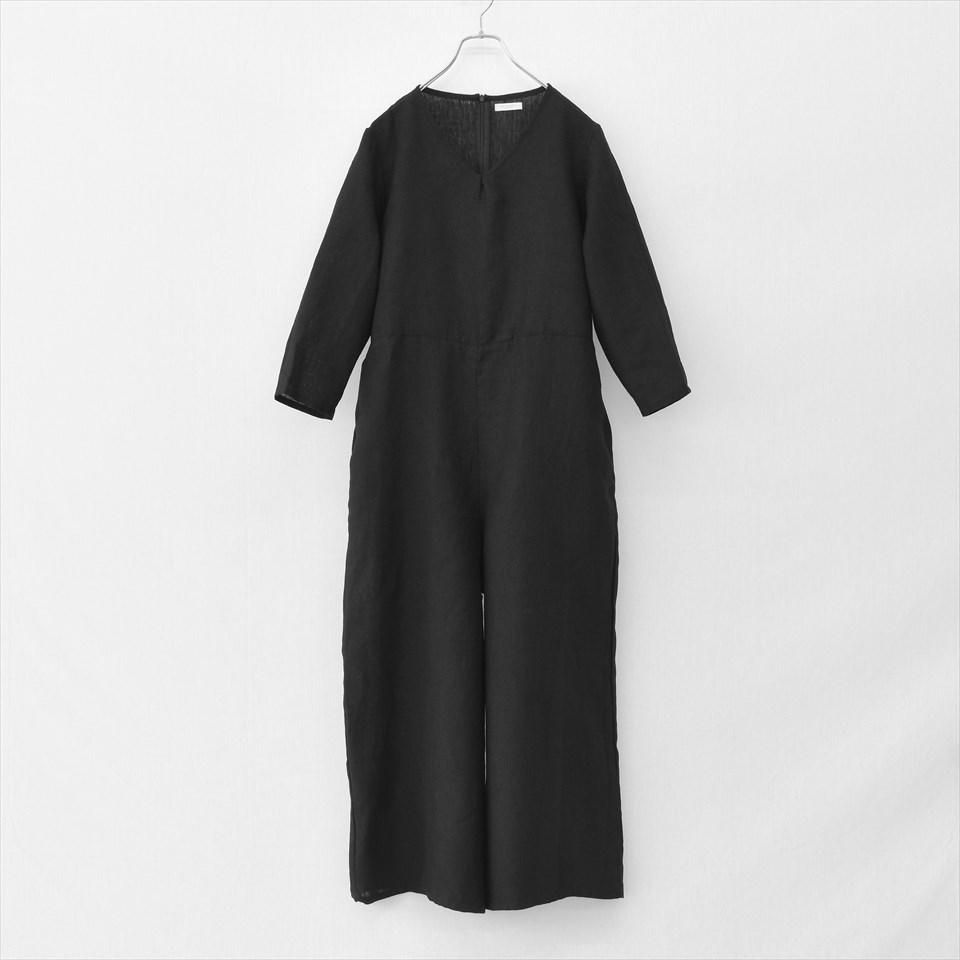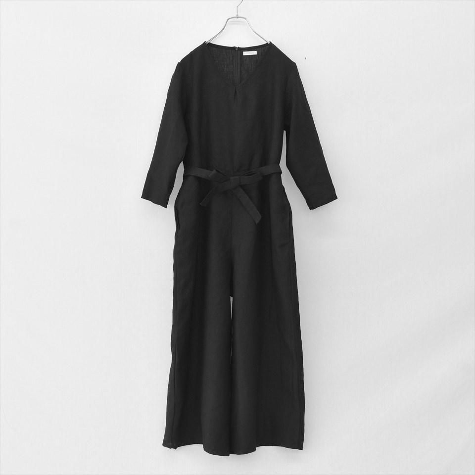 ネックラインがすっきりとしていて、トップはコンパクトに、ボトムはワイドパンツのようにゆったりとしたシルエットのジャンプスーツ。後ろはジッパーなので着脱も容易です。ウエストベルトは結ばずにワークスタイルでゆったりと着てもかっこいいですし、ウエストマークするとドレッシーな印象になります。ベルトは前後どちらで結んでも素敵です。両サイドにスリットポケット付き。