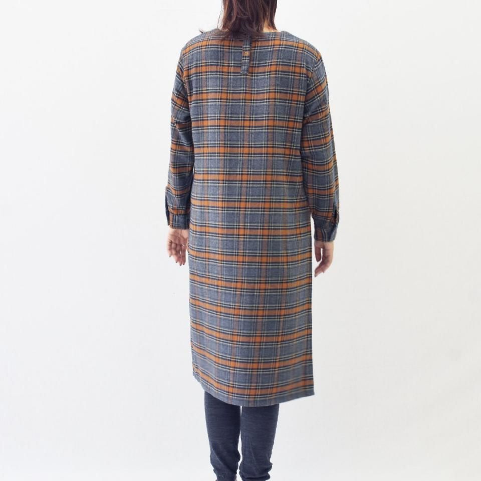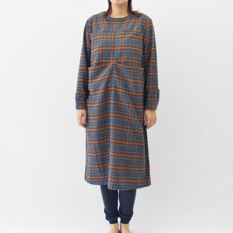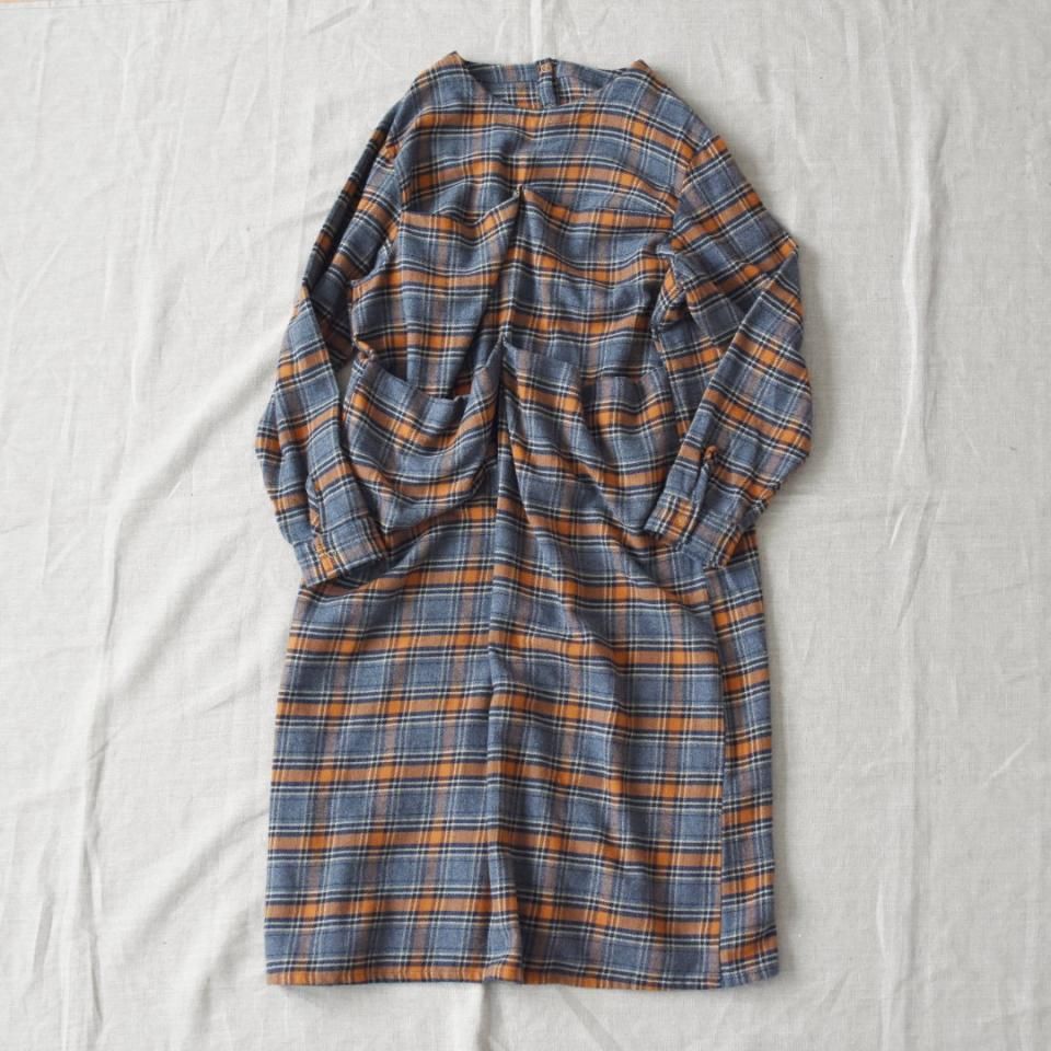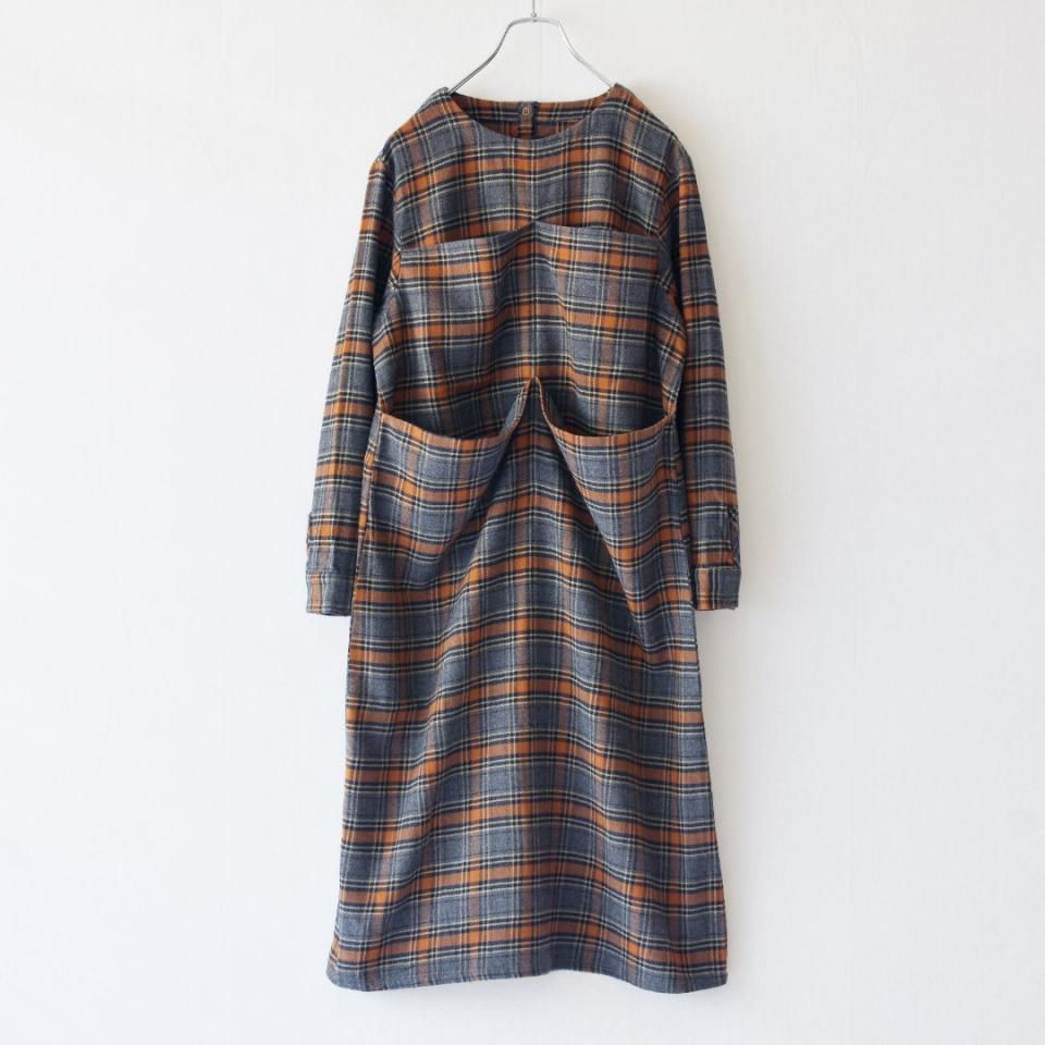 胸元から下に付いている大きな4つのポケットが特徴のワンピース。少し細めのシルエットですっきりとした印象。 ウールのような質感の綾起毛は綿100%なので洗濯も容易で、暖かな生地。柔らかくしなやかなドレープ感があり、シックな色味で大人らしく秋冬におすすめのワンピースです。