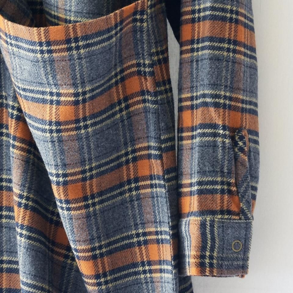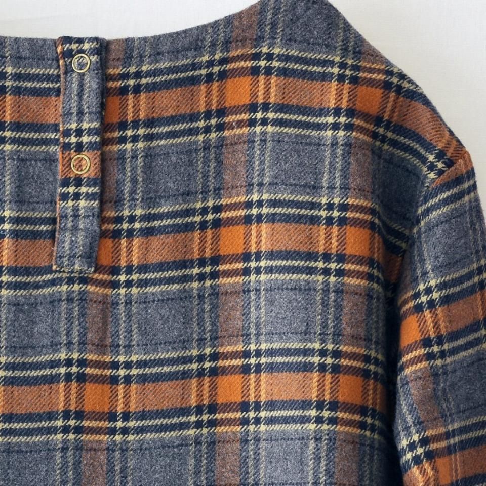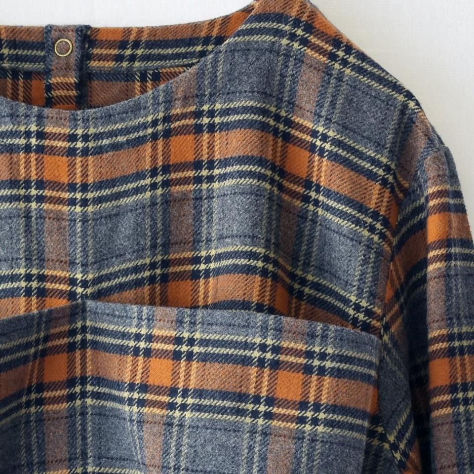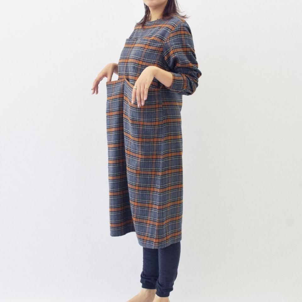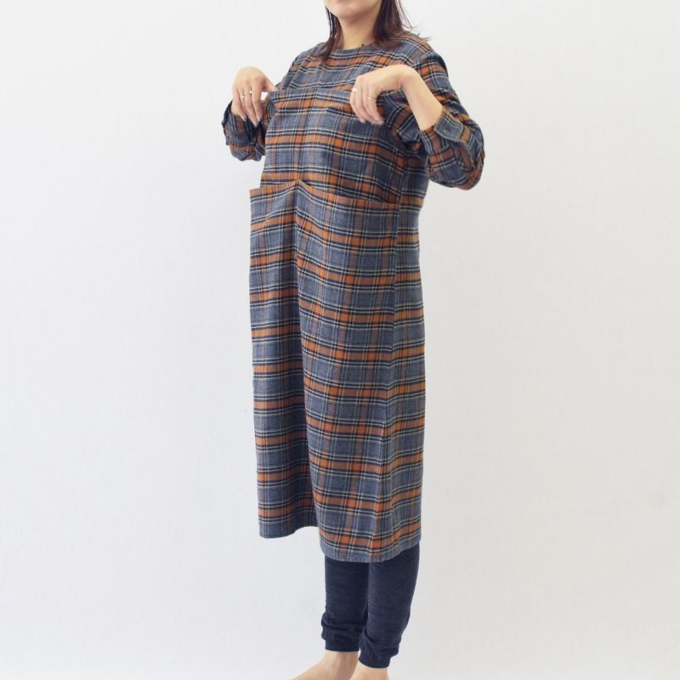 胸元から下に付いている大きな4つのポケットが特徴のワンピース。少し細めのシルエットですっきりとした印象。 ウールのような質感の綾起毛は綿100%なので洗濯も容易で、暖かな生地。柔らかくしなやかなドレープ感があり、シックな色味で大人らしく秋冬におすすめのワンピースです。