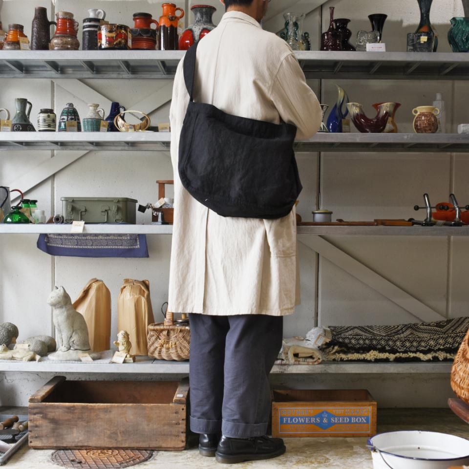 1940年〜1950年代のアメリカのニュースペーパーバッグ(新聞配達員のバッグ)を参考に、日常使いしやすいように全体的にサイズを見直し作られたバッグ。背面と側面にウチポケットを2つ装備して機能性を高めました。大きく開く口の部分は2つのホックで開閉します。ショルダーの長さは調整できませんが、男女問わず持っていただけるバランスになっています。