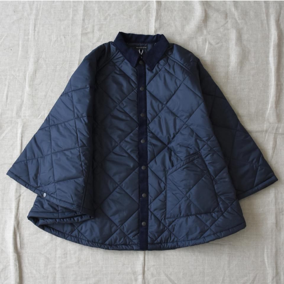 とても軽い中綿キルトを使用したケープ。冬物のコートの上からでもゆったり着られるシルエットで、椅子に座った状態でも、背もたれを包み込んで、太腿がちょうど収まる着丈なので、寒空の下から、デスクワークまで幅広いシーンで活躍します。男女兼用フリーサイズ。