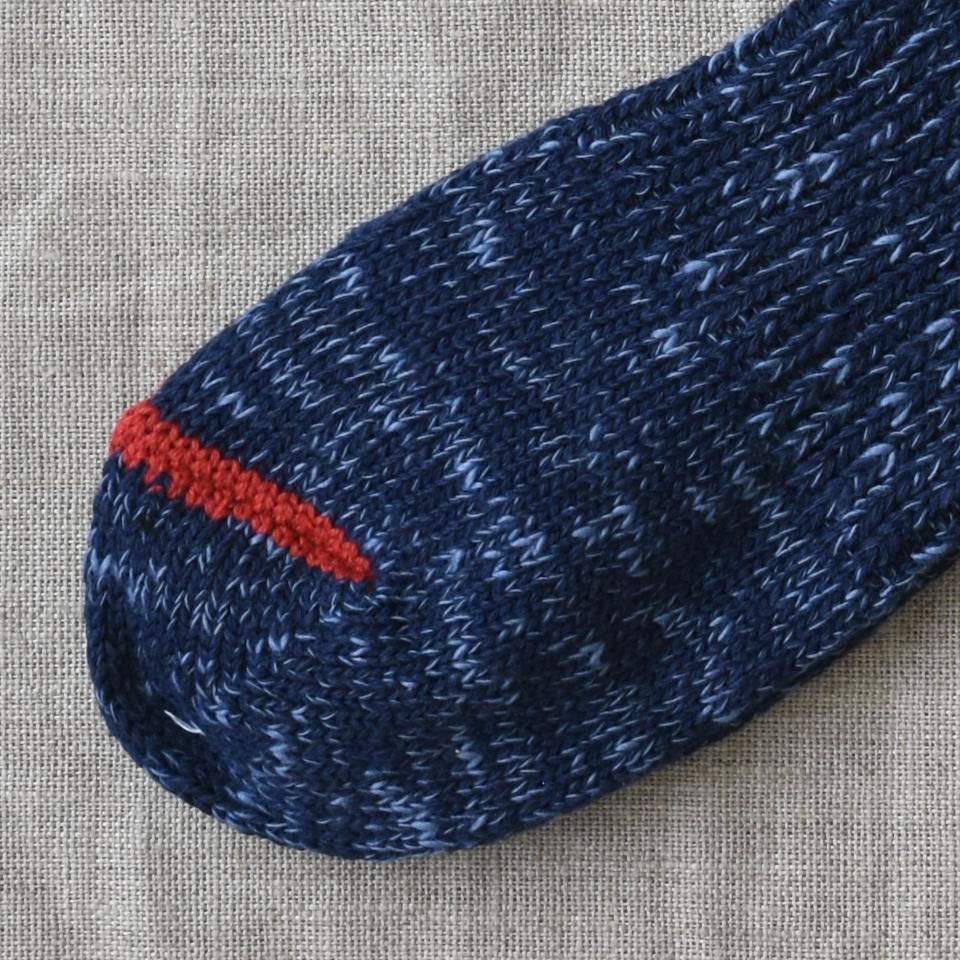 太めの糸で編み込まれた肉厚の生地はとても丈夫で蒸れにくく、締めつけすぎずズレにくいので長時間履いていても疲れにくい靴下です。土踏まずはリブ編みでフィット感があって履き心地抜群です。ブーツやスニーカー、サンダルなど靴を選ばず合わせやすいデザインです。耐久性がり履き心地も良く、アウトドアや作業用靴下としても最適な靴下です。